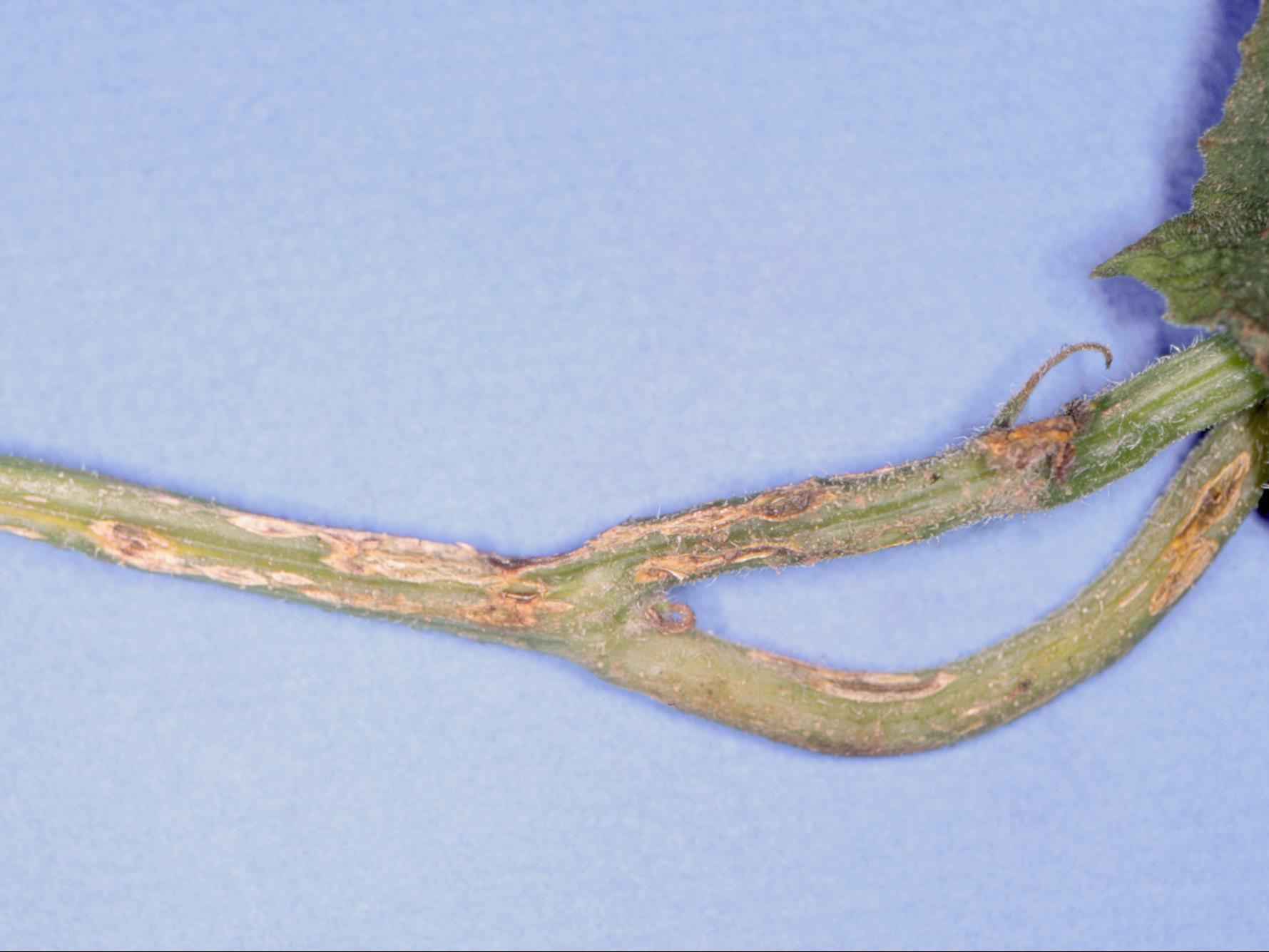 Description: Sur une portion de tige d’un plant de concombre de champ (var. 'Libanais'), présence de chancres blanchâtres, de forme elliptique et mesurant 5 à 7 mm de longueur. Les observations microscopiques ont révélé la présence du champignon Cladosporium sp., responsable de la gale chez les cucurbitacées. Il s'agit probablement de Cladosporium cucumerinum. Notez que sur cet échantillon, les feuilles et les fruits présentaient également des symptômes de la gale.