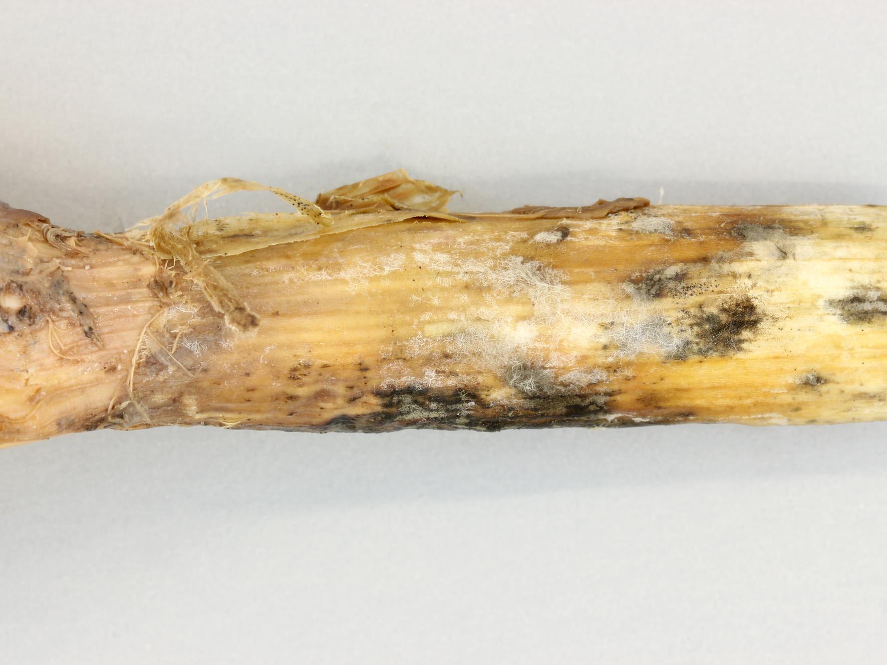 Description: Un plant d’ail d’automne (cv 'Music') montre une pourriture, une sporulation blanchâtre et quelques petits sclérotes noirs au col. Les tests de laboratoire ont révélé la présence de conidiophores et de conidies du champignon Botrytis sp., responsable de la pourriture du col chez les Allium.