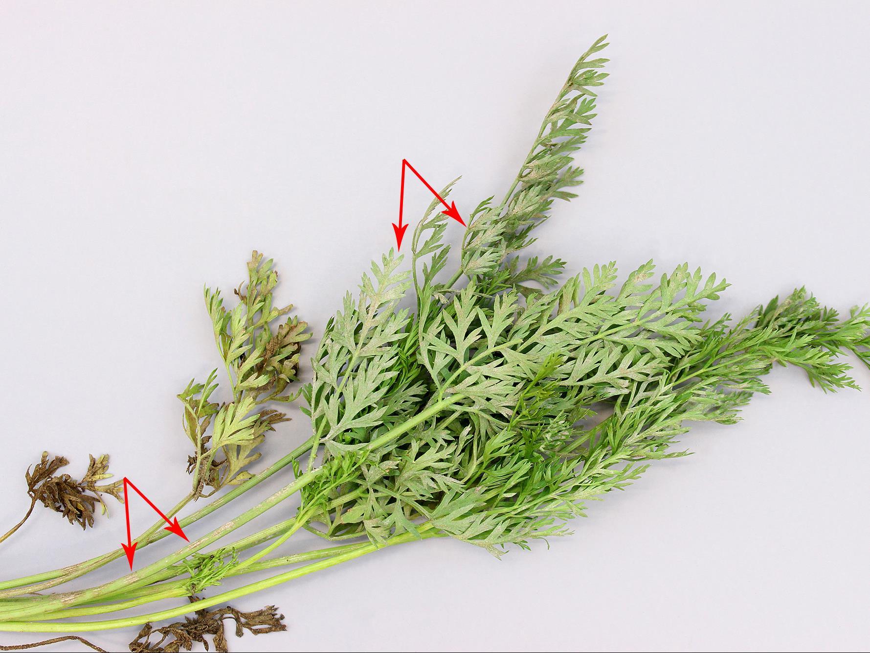 Description: Sur des feuilles de carotte, présence d’un fin duvet blanchâtre à grisâtre à la face inférieure et sur les pétioles (voir flèches). Les feuilles affectées prennent une coloration jaune puis brune et dépérissent. Les observations microscopiques ont révélé la présence de mycélium et de conidies du champignon Erysiphe sp., responsable de la maladie du blanc (oïdium). Il s’agit probablement d’Erysiphe heraclei, rapporté chez la carotte.