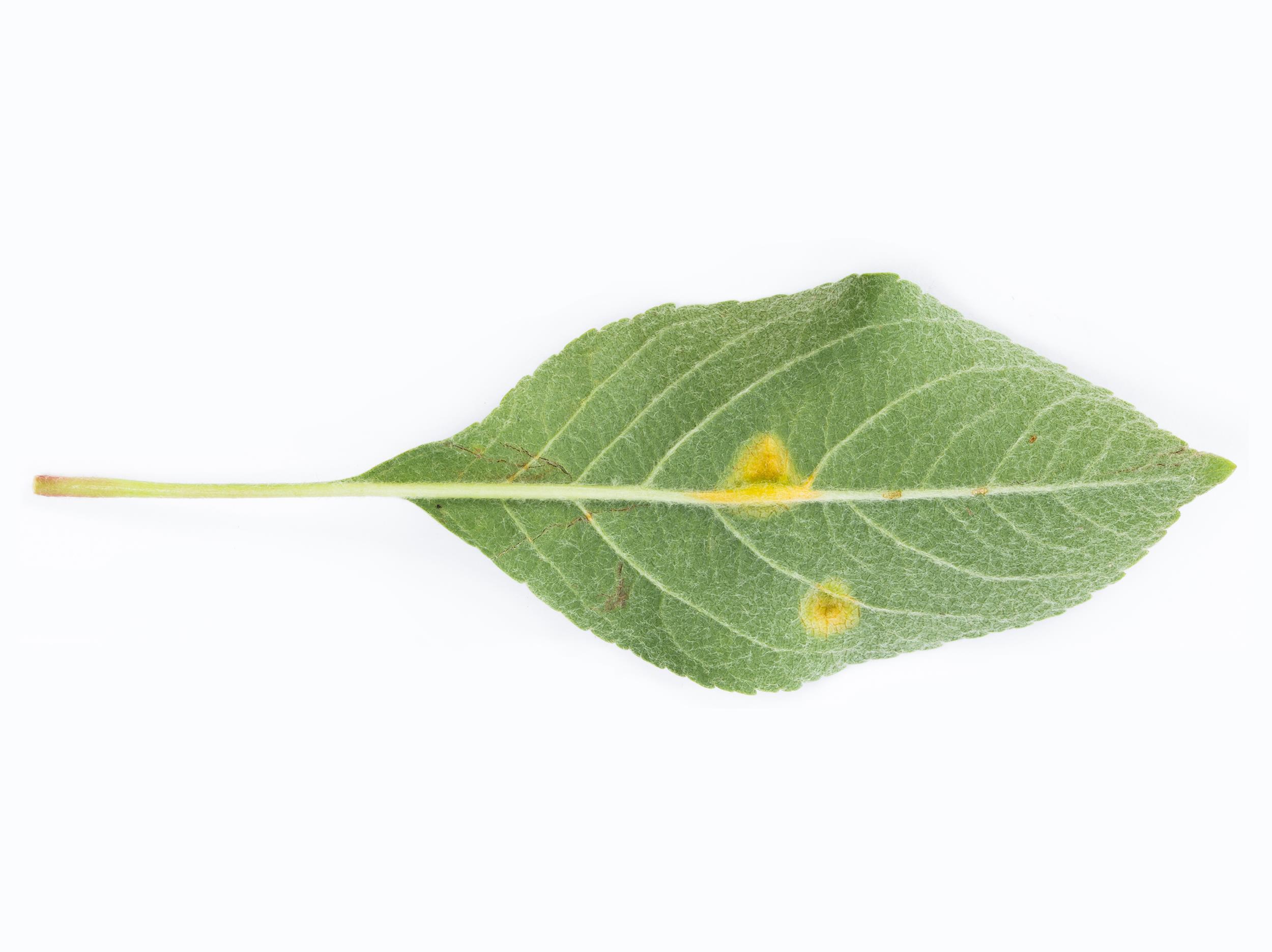 Description: À la face inférieure d’une feuille de pommetier ornemental, présence de taches jaune vif. Les observations microscopiques ont révélé la présence de spores caractéristiques du champignon Gymnosporangium sp., responsable d’une rouille.