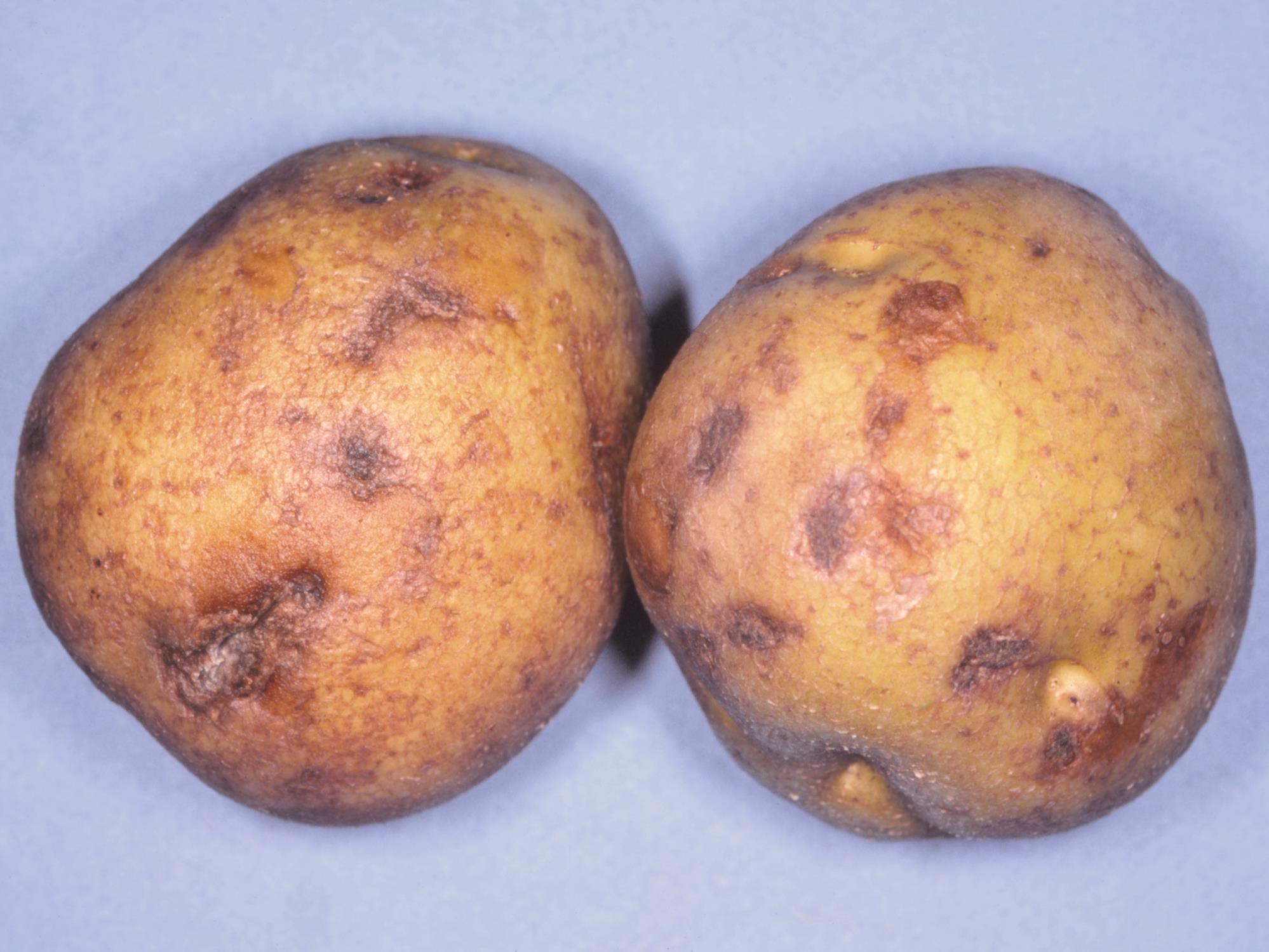Description: Sur le périderme des tubercules de pomme de terre (cv 'Superior') provenant d’un entrepôt, présence de taches brunes à noires, circulaires à irrégulières dont la dimension moyenne est de 1 cm. Ces taches sont légèrement déprimées. Les tubercules comptent entre 10 et 30 lésions. Les taches pénètrent dans la chair sur une profondeur de 1 à 2 mm (non visible ici). Les tests de laboratoire ont révélé la présence du champignon Alternaria solani, responsable de la brûlure hâtive (brûlure alternarienne) chez la pomme de terre.