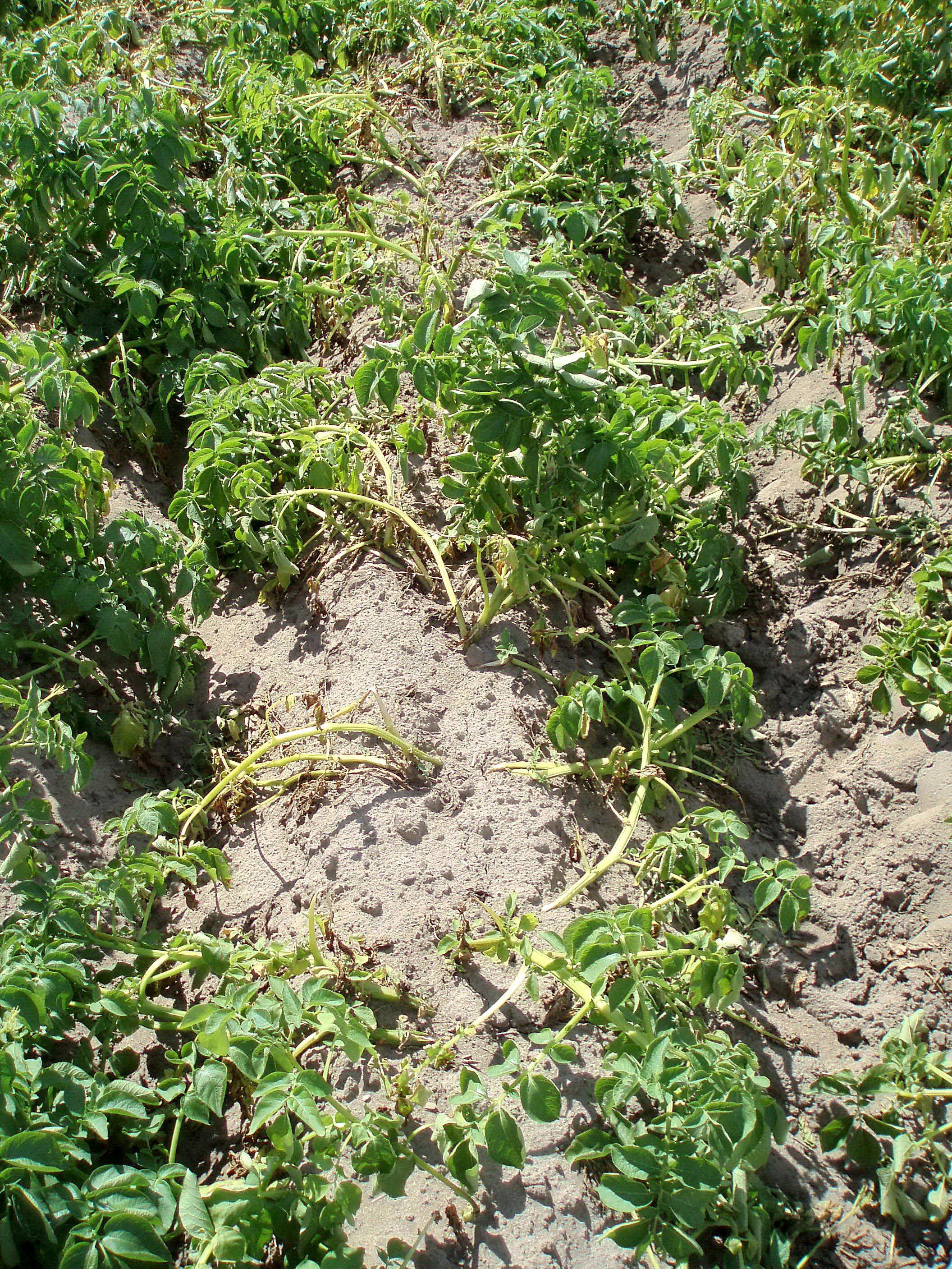 Description: Affaissement au sol de plants de pommes de terre (cv 'Norland') affaiblis par la présence de chancres beiges à la base des tiges et au collet. Les chancres sont sur un seul côté de la tige ou causent une constriction de la tige. Les tests de laboratoire ont révélé la présence du champignon Colletotrichum coccodes, responsable de la dartrose chez la pomme de terre.