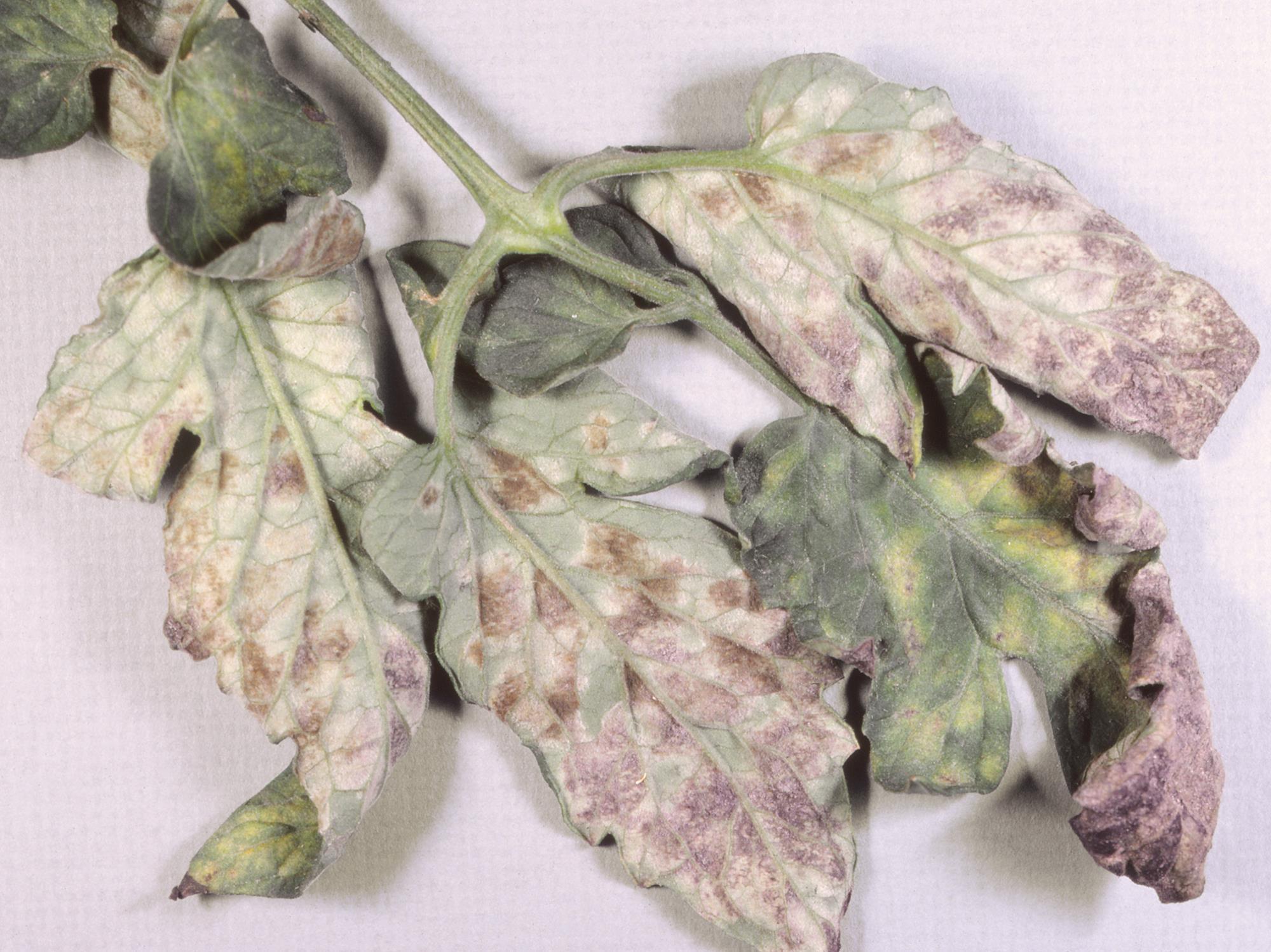 Légende: Taches jaunes ou blanches et mycélium brun sur feuille de tomate