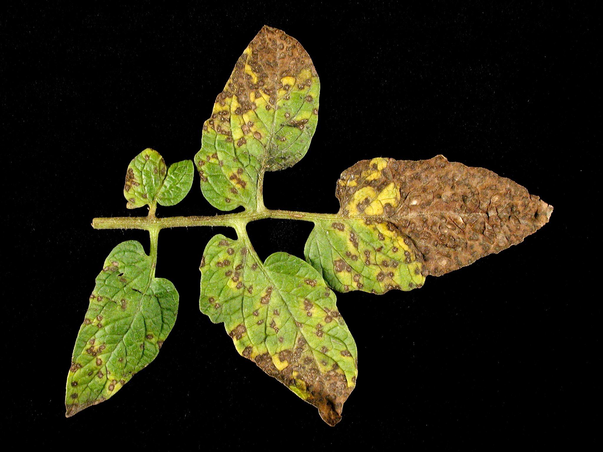 Description: Une feuille de tomate de champ montre de nombreuses petites taches brun pâle avec une marge foncée. Les taches sont fréquemment entourées d’un halo jaune. Elles sont réparties entre les nervures et souvent accolées à celles-ci. Un brunissement du limbe est visible et débute à l’apex. Les observations microscopiques ont révélé la présence du champignon Septoria lycopersici, responsable de la tache septorienne chez la tomate.