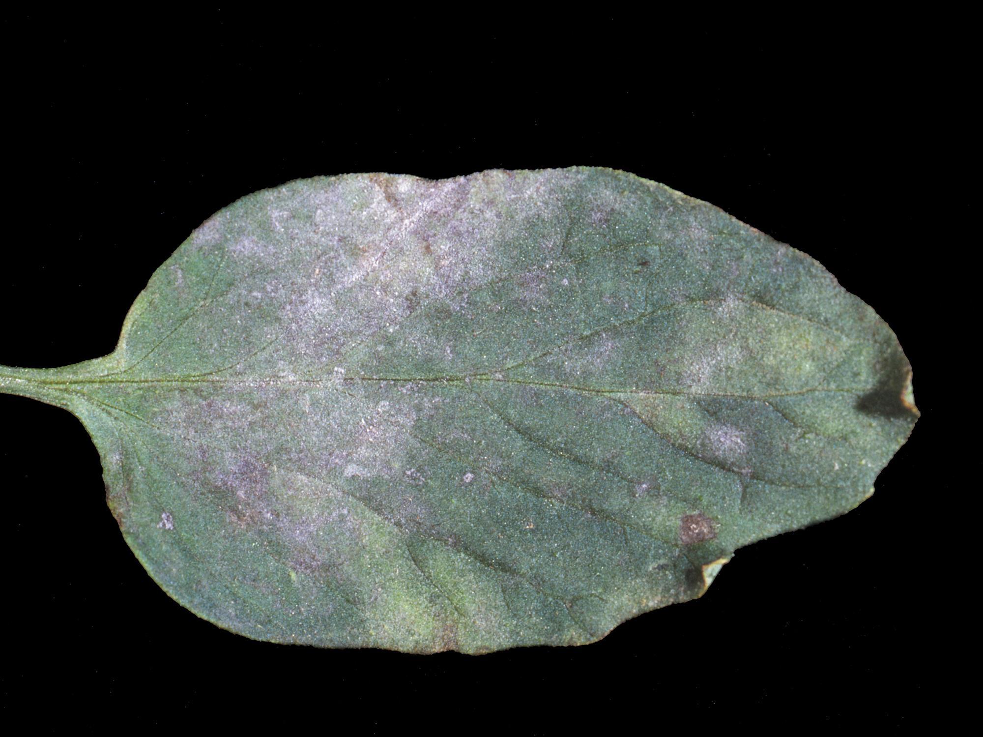 Légende: Taches et mycélium blanc sur foliole de tomate