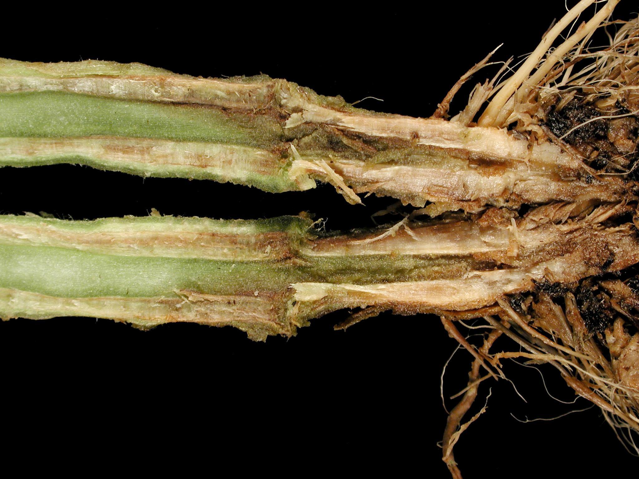 Description: Un plant de tomate de serre montre un brunissement du système vasculaire au collet et dans le bas de la tige. Extérieurement, la tige était sans symptôme mais le collet avait un chancre brun humide qui couvrait environ 25 % de sa circonférence. Les racines sont pourries et brunes et la majorité des racines ont perdu leur épiderme. Les plants étaient flétris et le feuillage avait de graves brûlures et des jaunissements. Les symptômes ont débuté sur les feuilles basales (non visible ici). Les tests de laboratoire ont révélé la présence du champignon Fusarium oxysporum f. sp. radicis-lycopersici (FORL), responsable de la fusariose des racines et du collet chez la tomate.