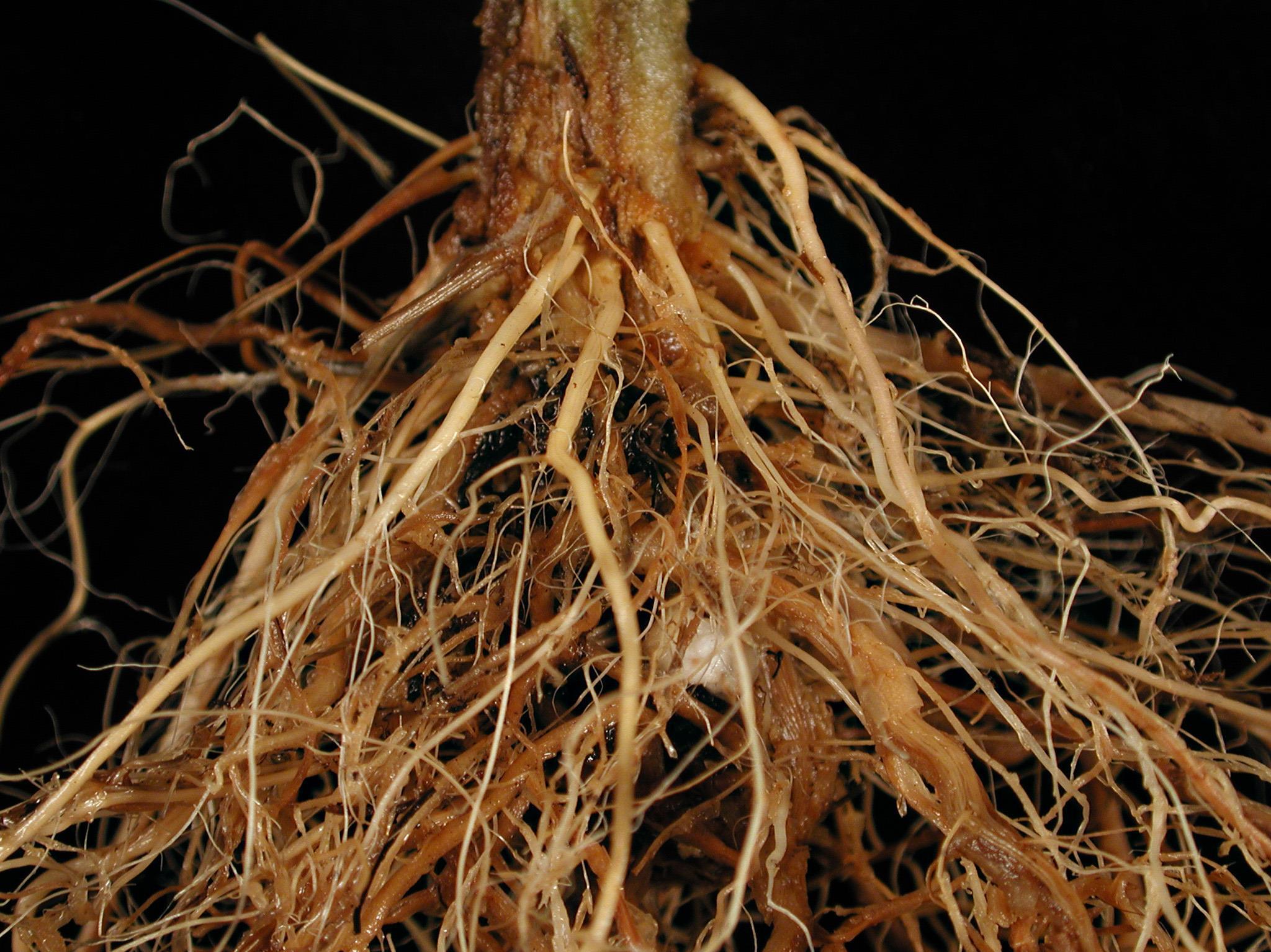 Description: Les racines d’un plant de tomate de serre montrent une pourriture brune et la majorité des racines avaient perdu leur épiderme. Ce plant montrait plusieurs symptômes dont un brunissement du système vasculaire, dans le bas de la tige et au collet. Extérieurement, la tige était sans symptôme tandis que le collet avait un chancre brun humide qui couvrait environ 25 % de sa circonférence. Les plants étaient flétris et le feuillage avait de graves brûlures et des jaunissements. Les symptômes avaient débuté sur les feuilles basales. Les tests de laboratoire ont révélé la présence du champignon Fusarium oxysporum f. sp. radicis-lycopersici (FORL), responsable de la fusariose des racines et du collet chez la tomate.