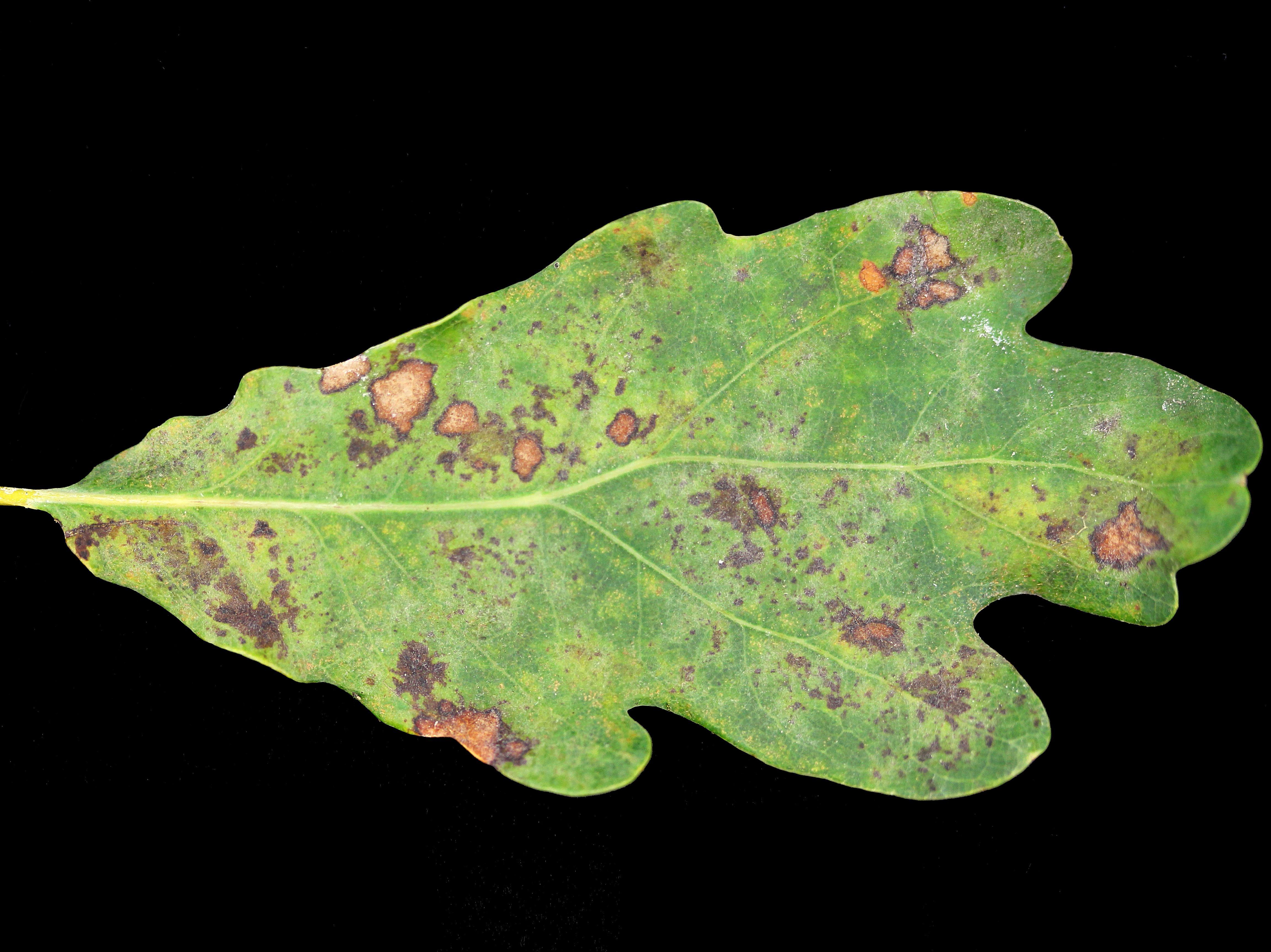 Description: À la face supérieure d’une feuille de chêne (cv 'Argenteo Marginata'), présence de deux types de taches. Les taches sont brun noir et très fines ou beige brun avec une marge foncée, se rapprochant de la brûlure. Un fin mycélium blanchâtre est accolé au limbe à la face supérieure. Un jaunissement diffus entre les nervures est également perceptible. Les observations microscopiques ont révélé la présence de conidiophores portant de longues chaînes de conidies caractéristiques d’un champignon causant la maladie du blanc (oïdium). Il s’agit probablement d’Erysiphe alphitoides, rapporté chez le chêne pédonculé.