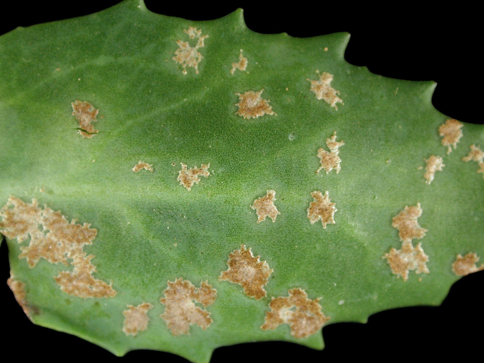 Description: Sur une feuille d'un sédum (cv 'Autumn Joy') cultivé en serre, présence de taches beiges à brunes, d’aspect sec, plutôt circulaires, dont le diamètre varie entre 1 et 7 mm. Les observations microscopiques ont révélé la présence du champignon Erysiphe sp., responsable du blanc (oïdium).