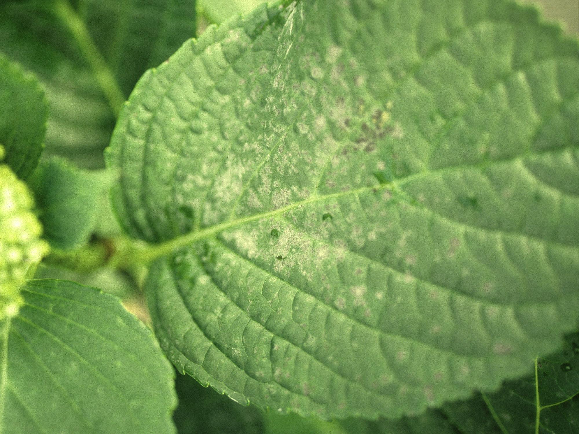 Légende: Mycélium blanc sur feuille d'hydrangée à grandes feuilles