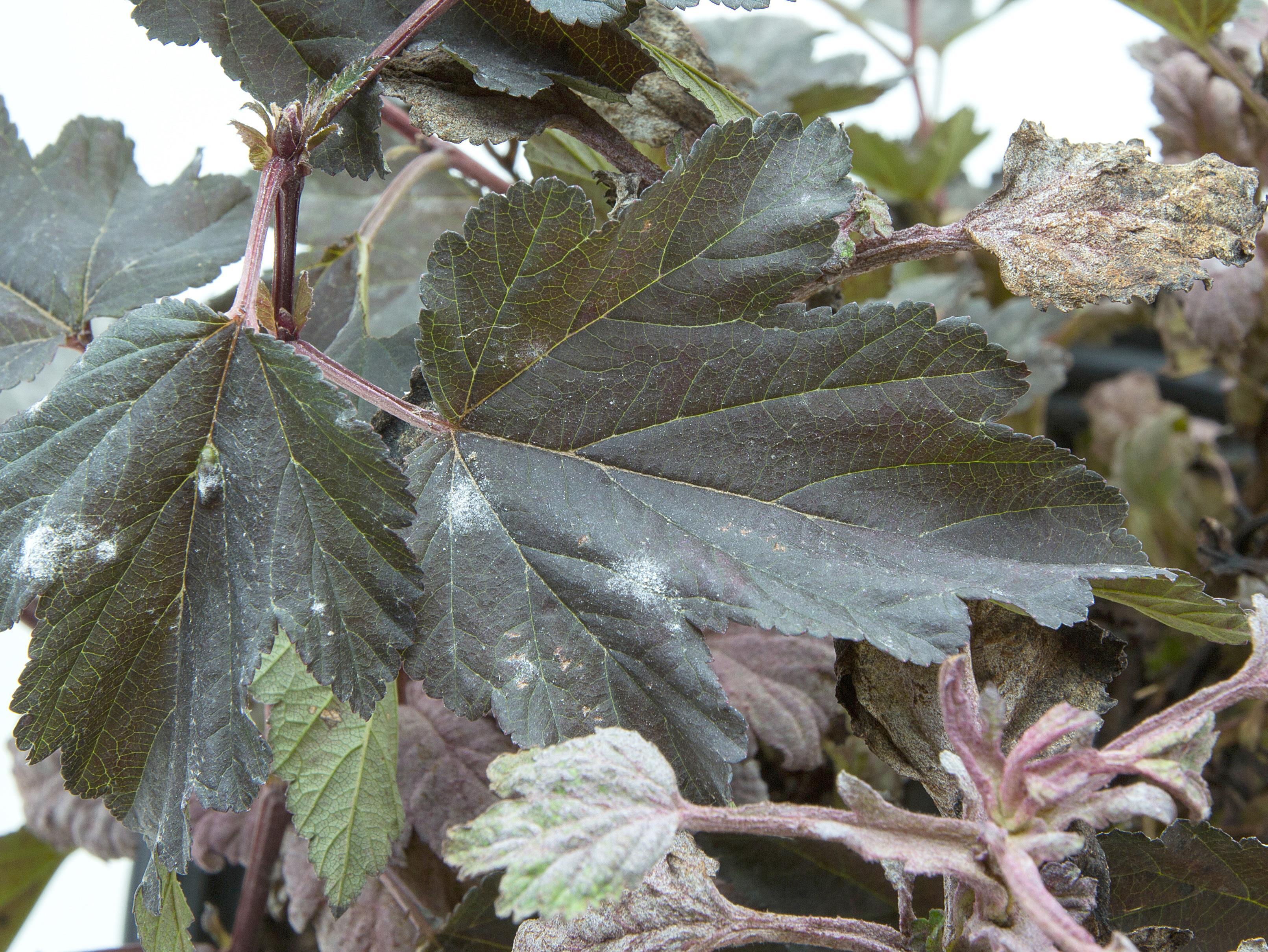 Description: Des feuilles de physocarpe montrent des taches circulaires couvertes d’un duvet de mycélium blanc. En général, les feuilles des tiges centrales sont difformes, blanchâtres à la face supérieure, épaisses et cassantes. Ces tiges sont difformes, courtes et trapues. Les entrenœuds sont très courts, ce qui donne une apparence de rosette (non visible ici). Les observations microscopiques ont révélé la présence du champignon Sphaerotheca sp. (Podosphaera sp.), responsable du blanc sur les feuilles et les tiges. Chez le physocarpe, le blanc est causé principalement par S. macularis et S. aphanis var. physocarpi. Noter qu’aucun phytoplasme n’a été détecté des dommages.