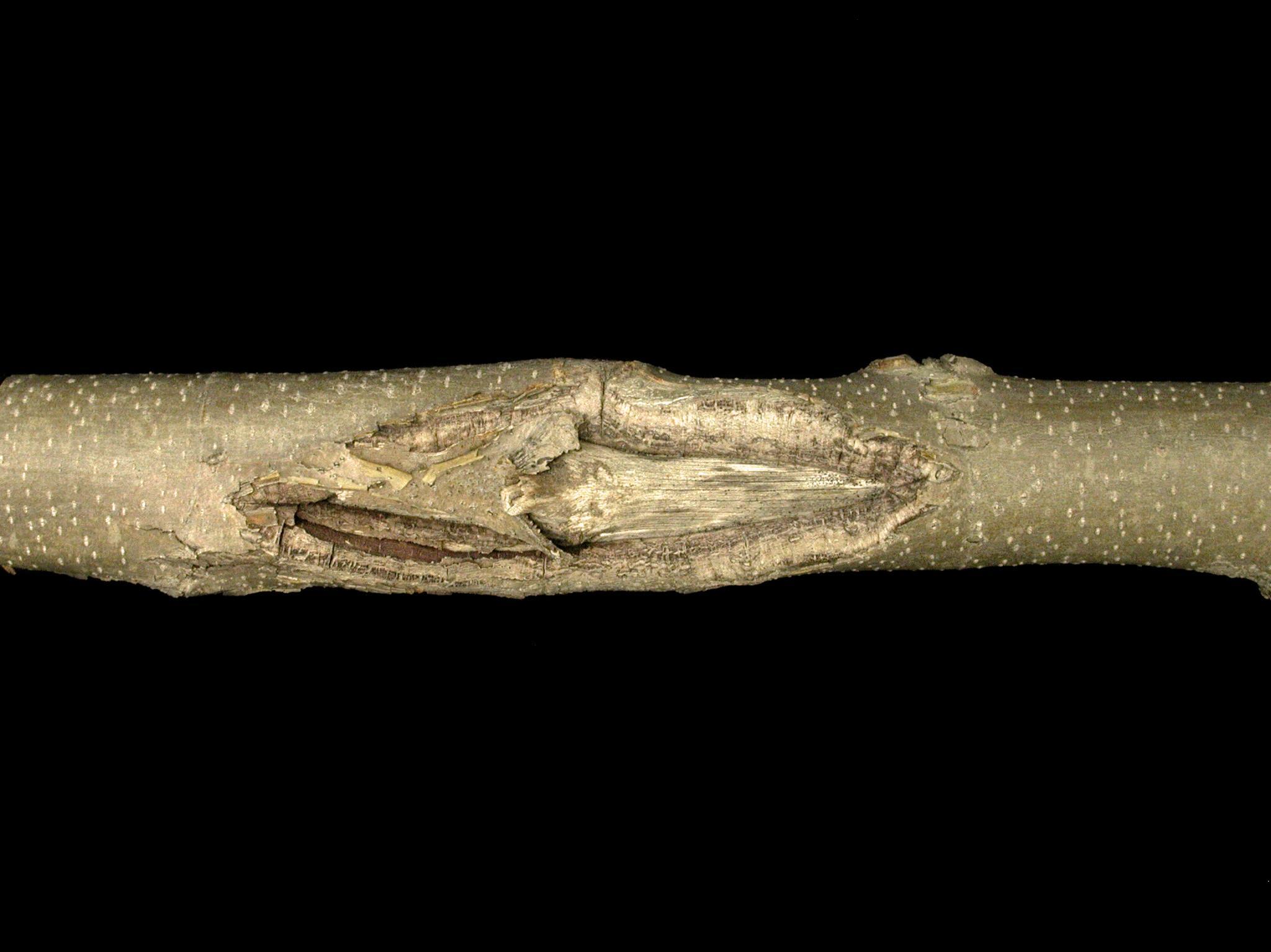 Description: Sur la branche de platane, présence d’un chancre d'une forme ovale, sec, dont l’écorce est fendue. Ces tissus sont cicatrisés. Le chancre affecte la moitié de la circonférence de la branche. Il y a également présence de nombreuses fructifications noires sur le chancre (peu visible ici). Les tests de laboratoire ont révélé la présence du champignon Cytospora sp., responsable du chancre cytosporéen. Ce champignon est souvent opportuniste, car il infecte les tissus déjà affaiblis.