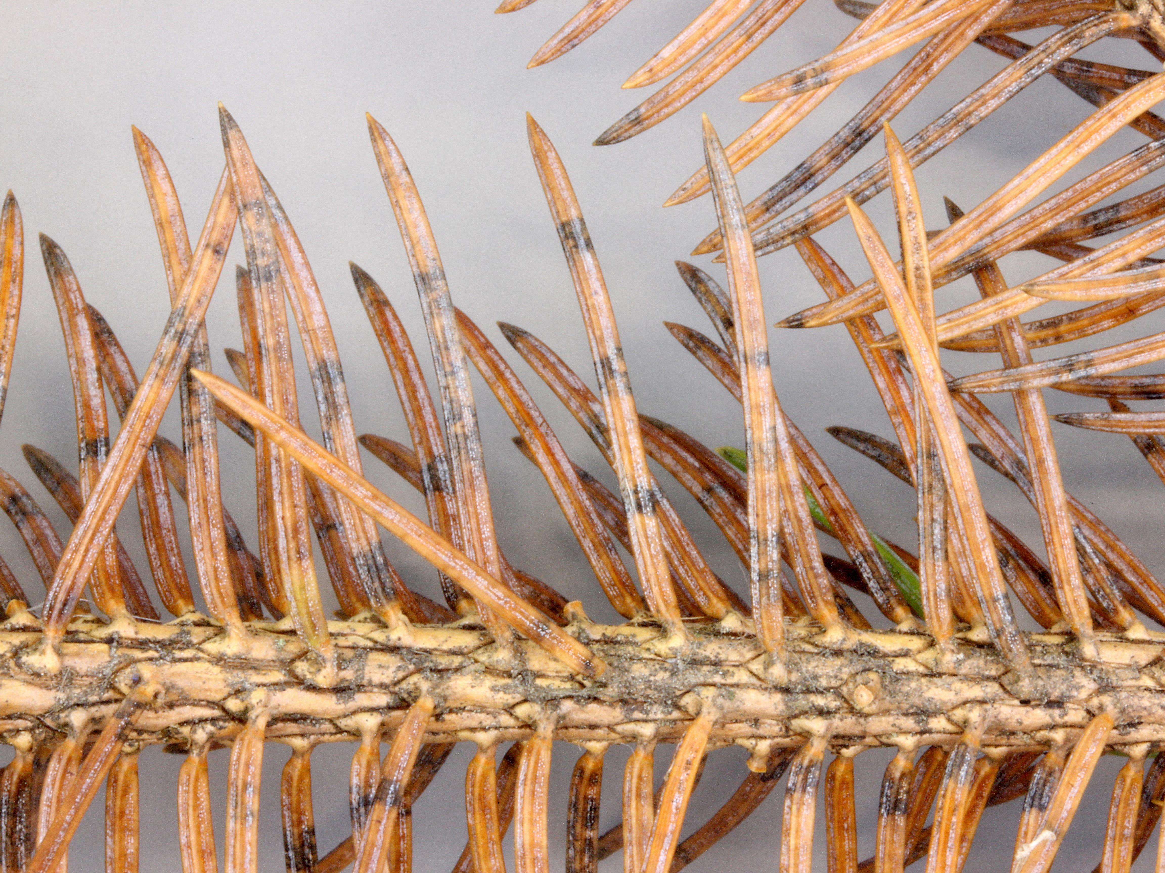 Description: Une vue rapprochée d’un rameau d'épinette bleue du Colorado montre de aiguilles de deuxième année qui sont brun rouille avec des bandes transversales noires. Les aiguilles de l’année sont souvent courtes et trapues, mais toujours vertes (non visible ici). Les tests de laboratoire ont révélé la présence de pycnides et de conidies du champignon Rhizosphaera sp., responsable des rouges des conifères. Il s’agit probablement de Rhizosphaera kalkhoffii, l’espèce la plus fréquemment rapportée chez l’épinette bleue du Colorado. Selon un expert du Ministère des Forêts, de la Faune et des Parcs (MFFP), les bandes transversales noires auraient été causées par le champignon Lophomerum sp. ou Lophodermium sp., responsable du rouge des conifères, mais ils n’ont pas été observés ici.