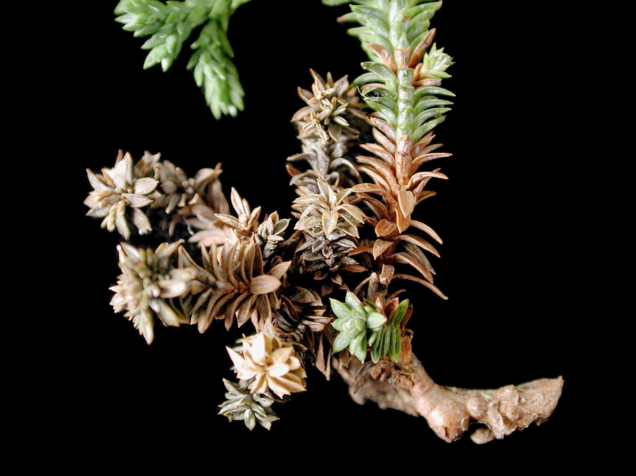 Description: Une vue rapprochée des pousses annuelles d’un faux-cyprès montre des aiguilles brunes et d’aspect brûlé. Le brunissement progresse vers l’extrémité des pousses. Les observations microscopiques ont révélé la présence d’acervules et de conidies du champignon Pestalotiopsis sp. Il s’agit probablement de Pestalotiopsis funerea, responsable de la brûlure des aiguilles chez les conifères.