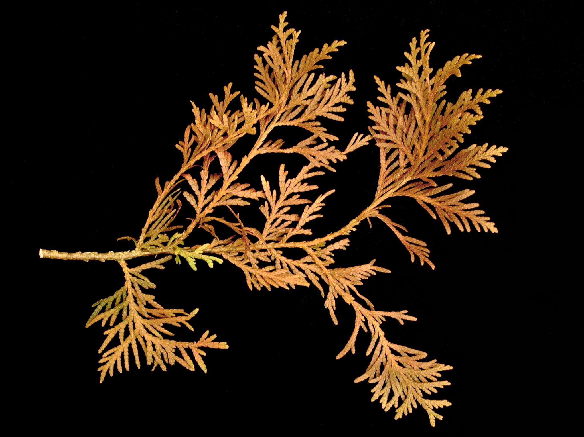 Description: Sur un jeune cèdre blanc de 60 cm de hauteur, les feuilles sont brun rougeâtre. Le système racinaire est noir et pourri (non visible ici). Les tests de laboratoire ont révélé la présence du champignon Phytophthora sp. dans les racines. L’état dépérissant du système racinaire explique l’anomalie de coloration observée sur le feuillage.