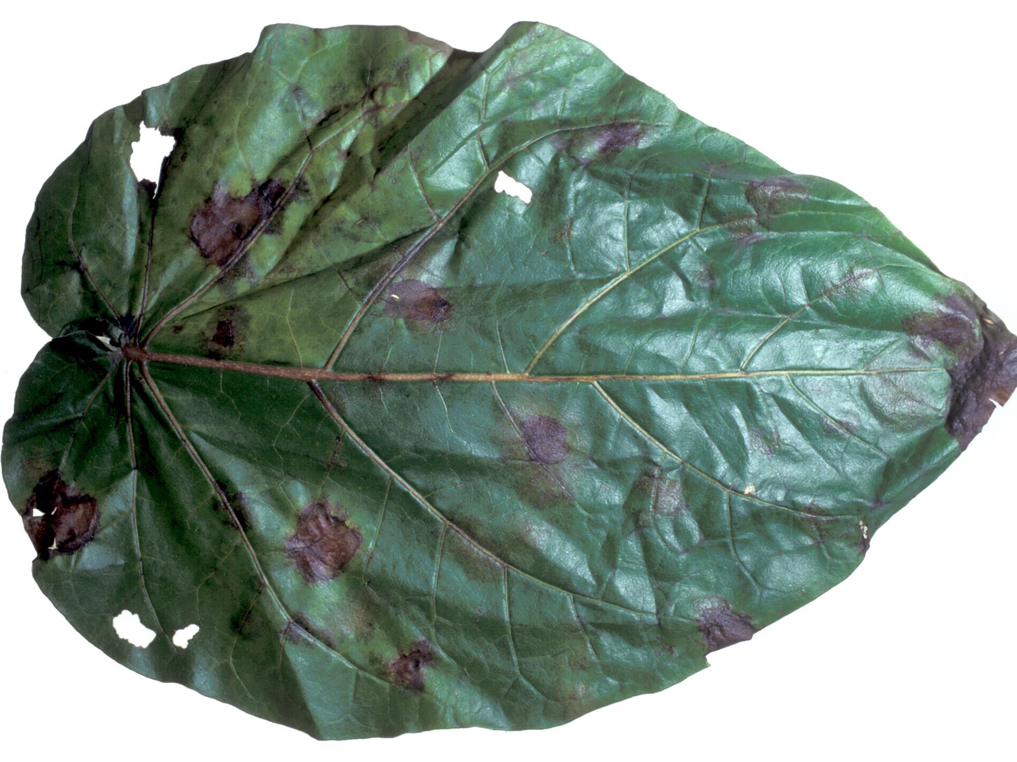 Description: À la face supérieure d’une feuille d’un arbre à tomate (Cyphomandra), présence de grandes taches nécrotiques noires situées à l’apex et près des nervures. Les observations microscopiques ont révélé la présence du champignon Erysiphe sp., responsable du blanc (oïdium).