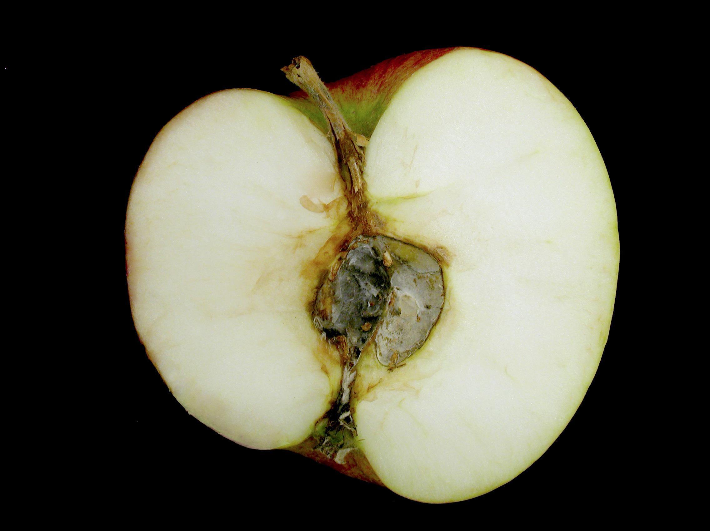 Description: Présence d’une pourriture grisâtre à noirâtre dans les loges carpellaires d’une pomme. Les tests de laboratoire ont révélé la présence du champignon Alternaria alternata, responsable de la pourriture du cœur chez le pommier.