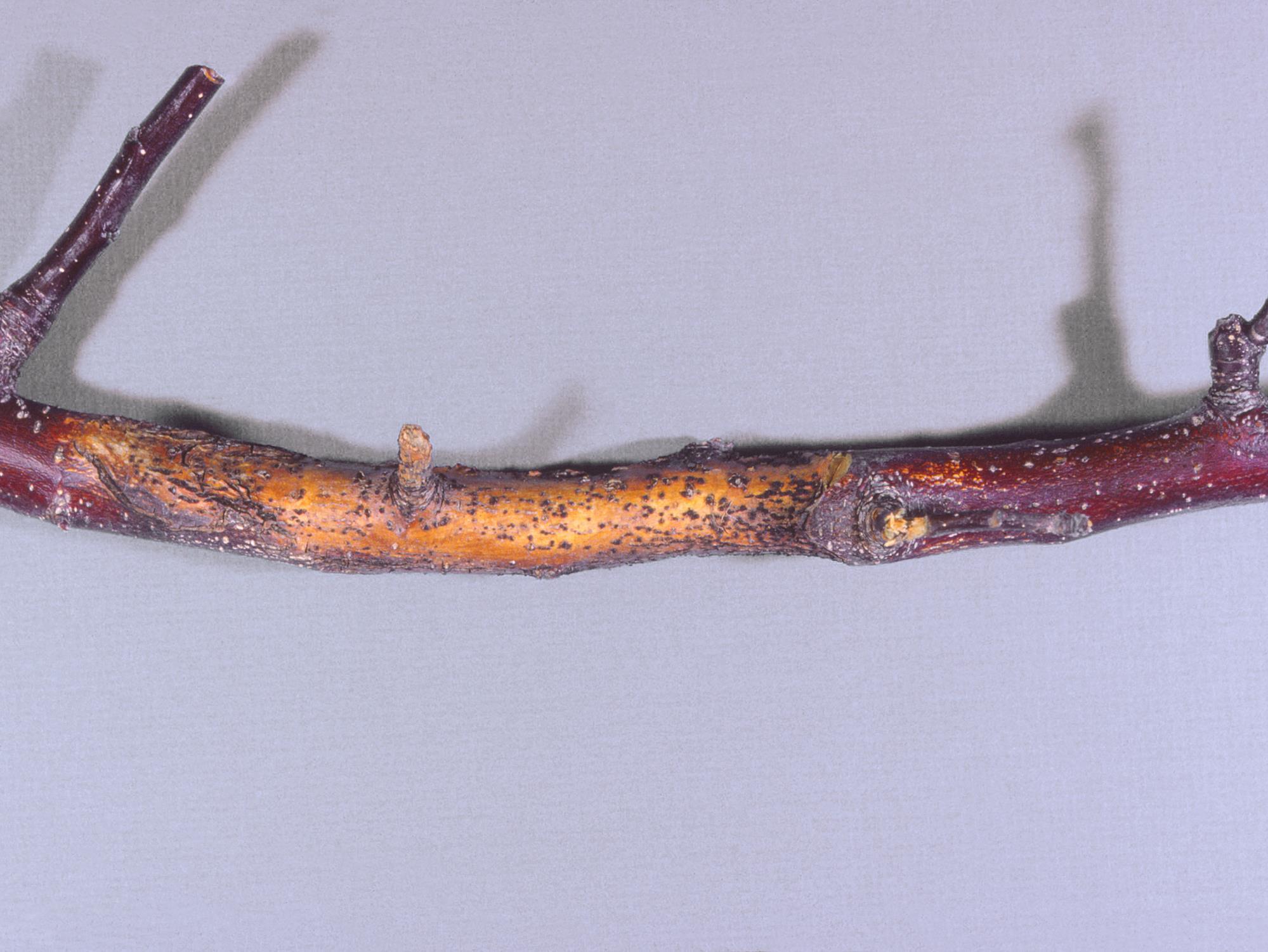 Description: Sur un rameau de pommier, présence d’un chancre déprimé jaune recouvert de nombreuses fructifications noires. Le Service national d'identifications fongiques d'Agriculture et Agroalimentaire Canada (AAC) a identifié le champignon Nectria cinnabarina, responsable du dépérissement nectrien (maladie du corail). Les fructifications noires sont des sporodochies matures. La brûlure bactérienne n’a pas été détectée des dommages.