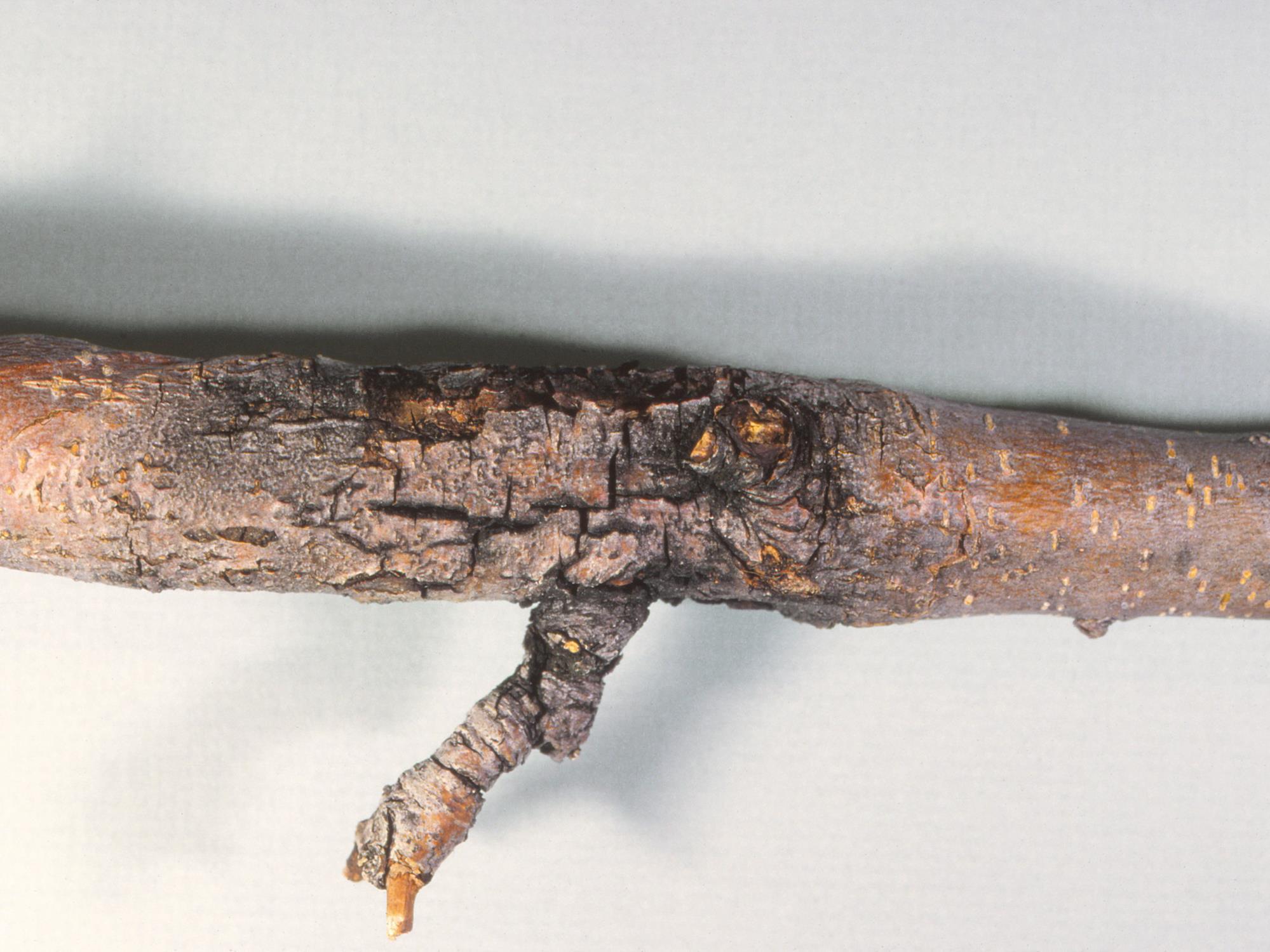 Description: Un segment de branche de pommier montre un chancre brun et une sporulation noire. Le chancre est parsemé de fissures et encercle la branche. Les tests de laboratoire ont révélé la présence du champignon Botryosphaeria sp., responsable du chancre à Diplodia.