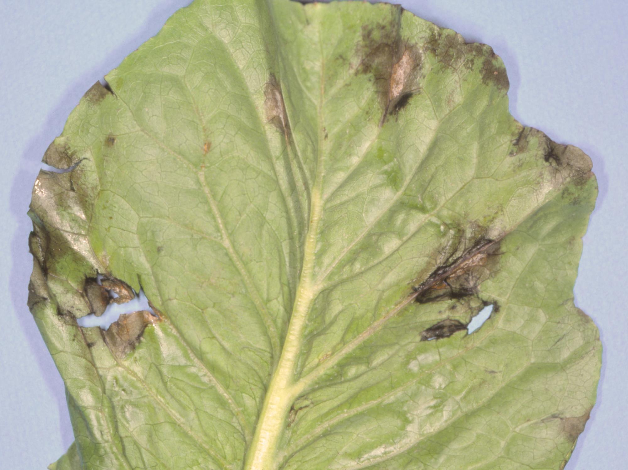 Description: À la face inférieure d’une feuille de laitue de champ, présence de taches brunes délimitées par les nervures sur lesquelles une croissance fongique blanche est visible. Les observations microscopiques ont révélé la présence de sporanges du champignon Bremia lactucae, responsable du mildiou chez la laitue.