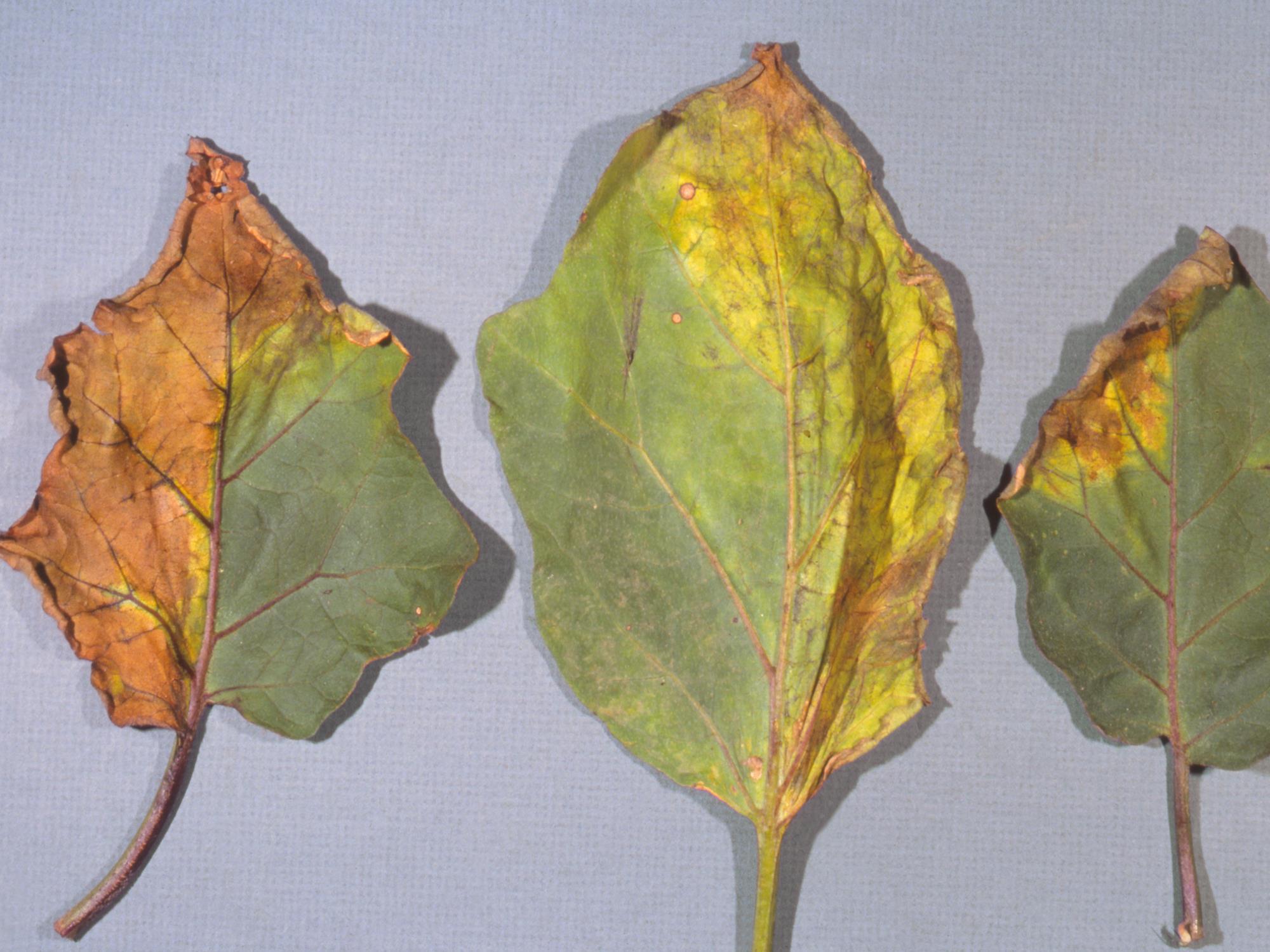 Description: Des feuilles d’aubergine (cv 'Classic') montrent un jaunissement puis un brunissement localisé sur le limbe. Ces anomalies de coloration sont majoritairement situées sur un seul côté du limbe. Le collet montrait un brunissement localisé du système vasculaire (non visible ici). Les tests de laboratoire ont révélé dans le collet, la présence du champignon Verticillium sp., responsable de la verticilliose. Il s’agit probablement de V. dahliae. Ce champignon est responsable des symptômes observés sur les feuilles.