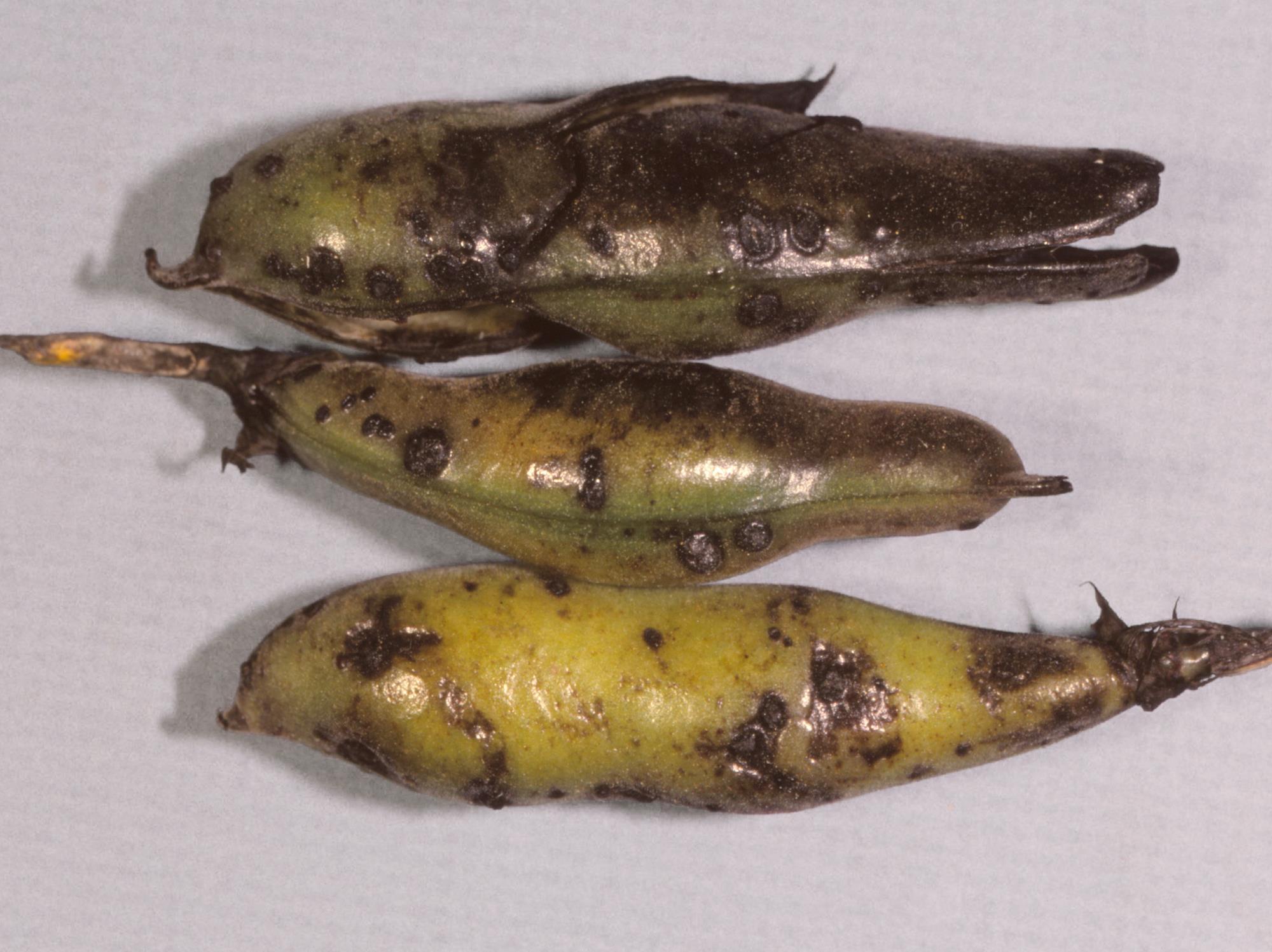 Description: Des gousses montrent des taches noires sur l’épiderme. Les tests de laboratoire ont révélé la présence du champignon Botrytis sp., responsable de la tache chocolat chez la gourgane.