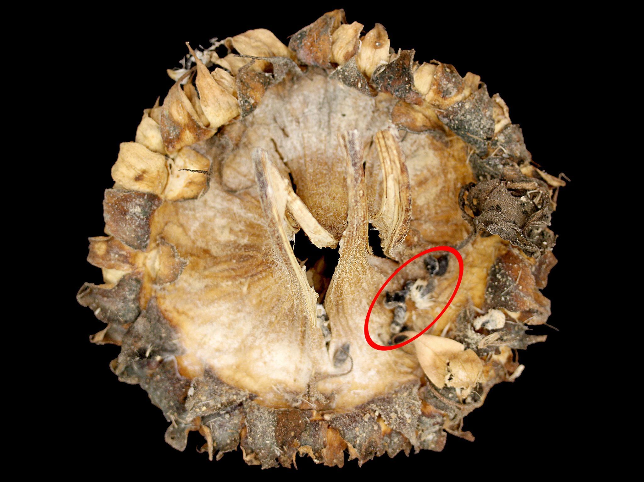 Description: Le dessous d’un capitule de tournesol oléagineux est pourri et montre un mycélium blanc pur et des sclérotes noirs (voir cercle). Les tests de laboratoire ont révélé la présence du champignon Sclerotinia sclerotiorum, responsable de la pourriture sclérotique chez le tournesol.