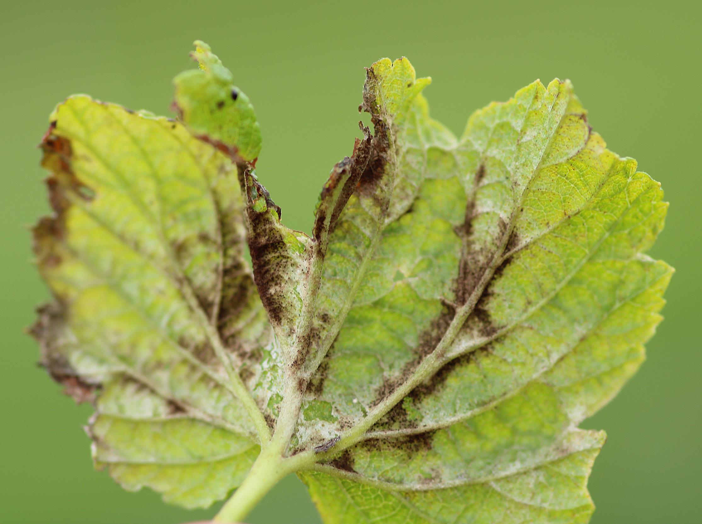: Face inférieure d’une feuille de cassis démontrant des symptômes de l’oïdium brun. Le duvet blanc longe les nervures et le limbe brunit par endroits.
