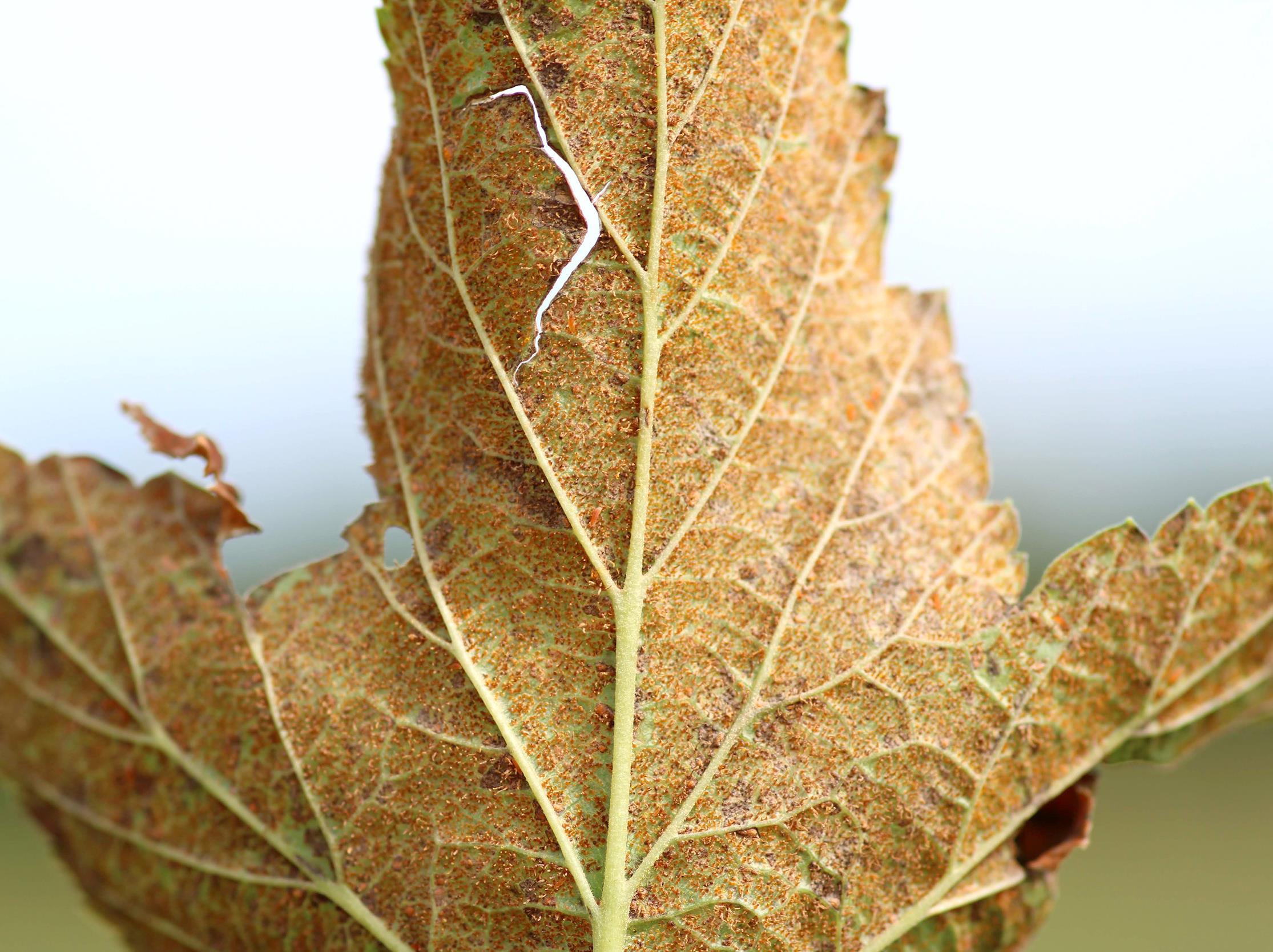 Description: Duvet orangé formé de nombreuses télies de Cronartium ribicola sur la face inférieure d’une feuille de cassissier fortement atteinte par la rouille vésiculeuse du pin blanc.