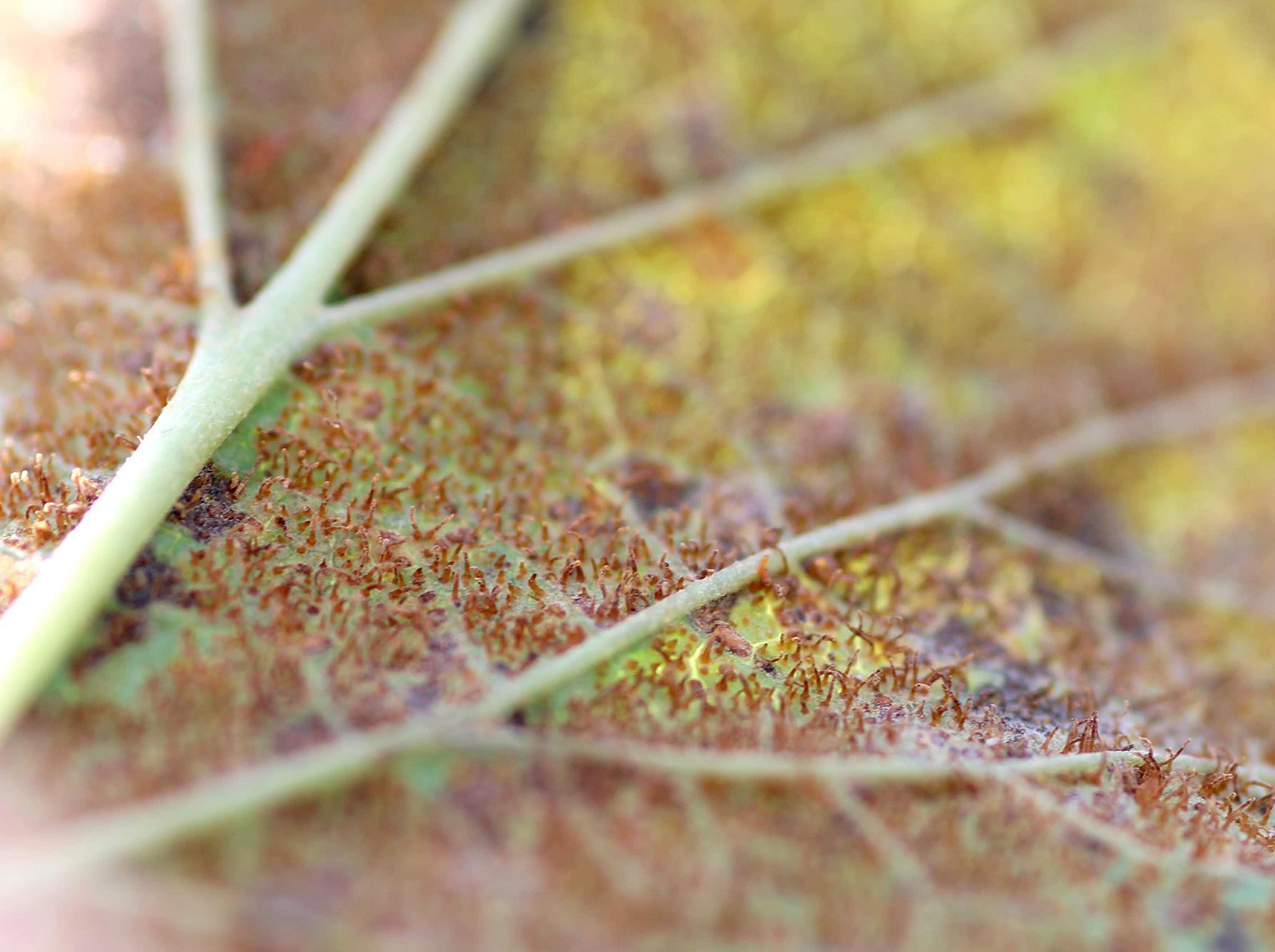 Description: Duvet orangé formé de nombreuses télies de Cronartium ribicola sur la face inférieure d’une feuille de cassissier fortement atteinte par la rouille vésiculeuse du pin blanc. De près, les télies ressemblent à de petites cornes gélatineuses.