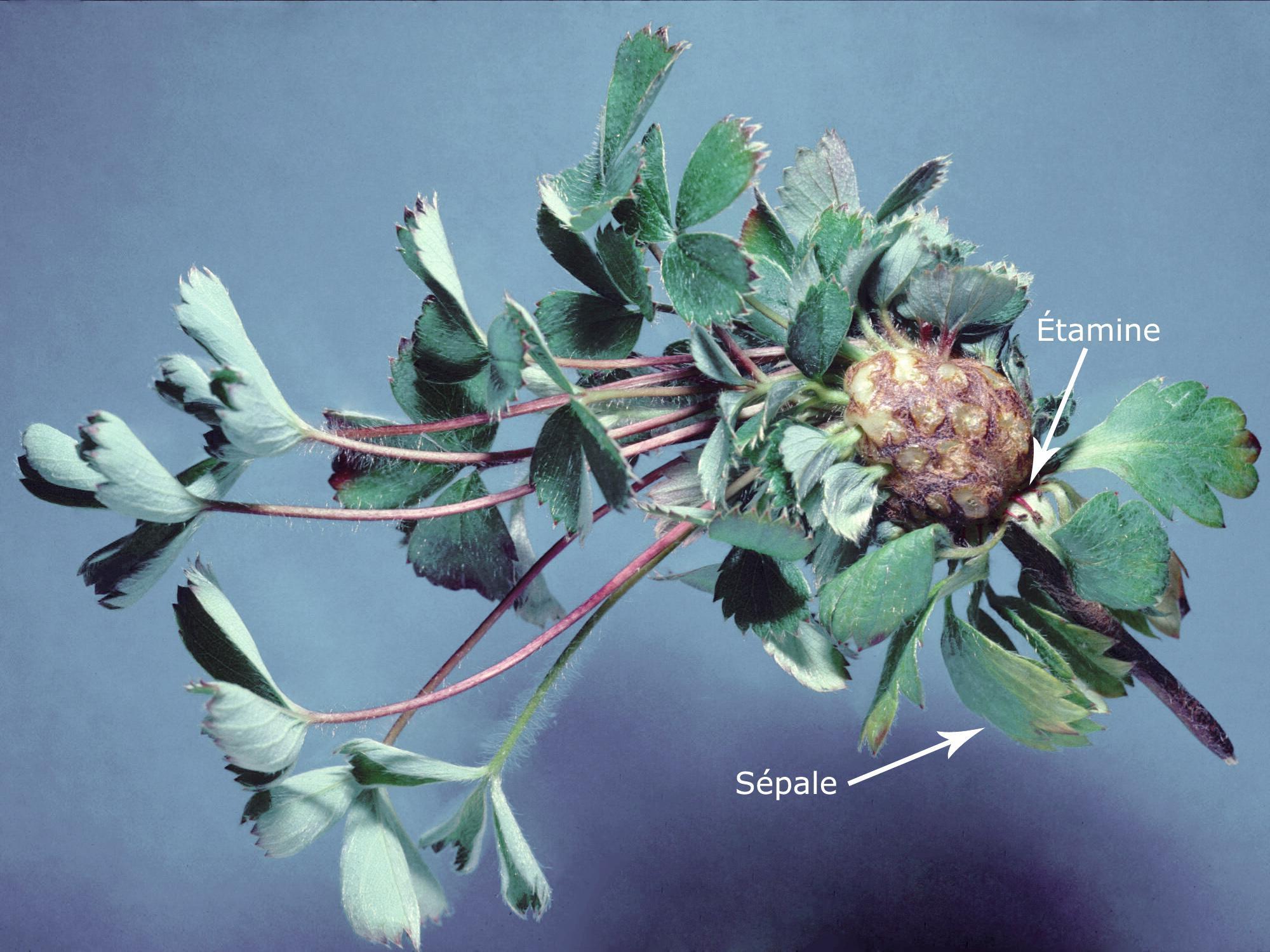Description: Une fraise est sévèrement déformée et se manifeste par une croissance végétative importante à partir du fruit. On dirait qu’un nouveau plant se développe à partir de la fraise. Le fruit porte quelques akènes immatures et déformés. Ces déformations sont caractéristiques des phytoplasmes et causent la jaunisse de l’aster (syn. la phyllodie infectieuse des akènes) chez le fraisier.