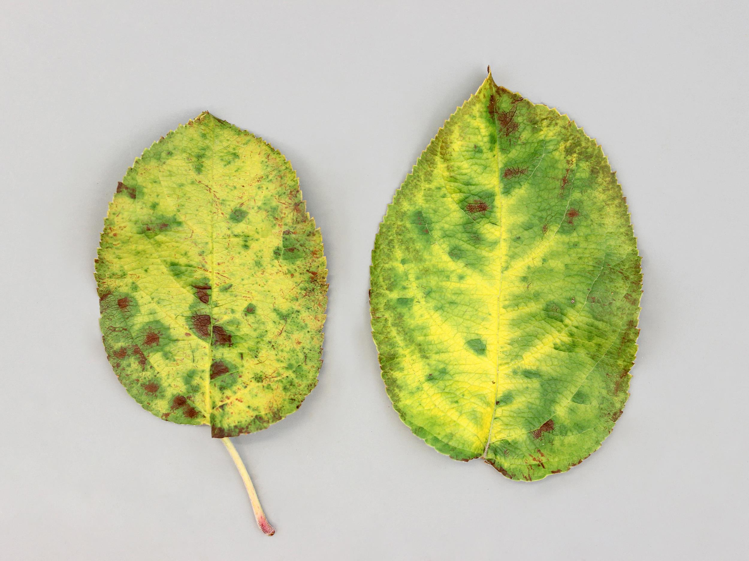 Description: Des feuilles d'un pommier montrent un jaunissement du limbe et des nervures et quelques taches brun rougeâtre. Les tests de laboratoire ont révélé la présence d’un phytoplasme et ce résultat a été conformé par le séquençage d’une partie de son génome. Selon le résultat du séquençage, il pourrait s’agir du phytoplasme de la jaunisse de l’aster.