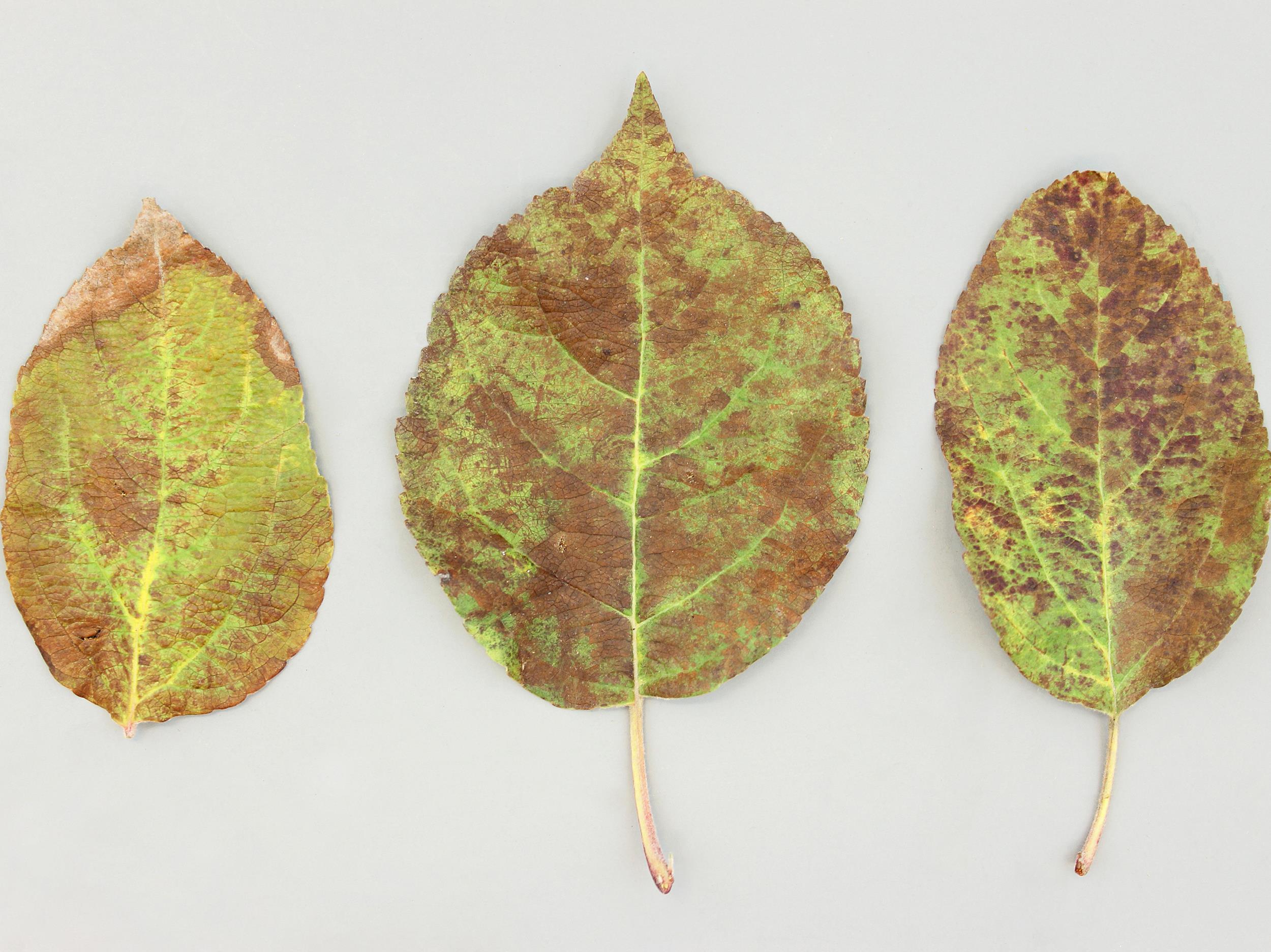 Description: Des feuilles d’un pommier montrent une coloration brun rougeâtre du limbe entre les nervures. Les tests de laboratoire ont révélé la présence d’un phytoplasme et ce résultat a été conformé par le séquençage d’une partie de son génome. Selon le résultat du séquençage, il pourrait s’agir du phytoplasme de la jaunisse de l’aster.