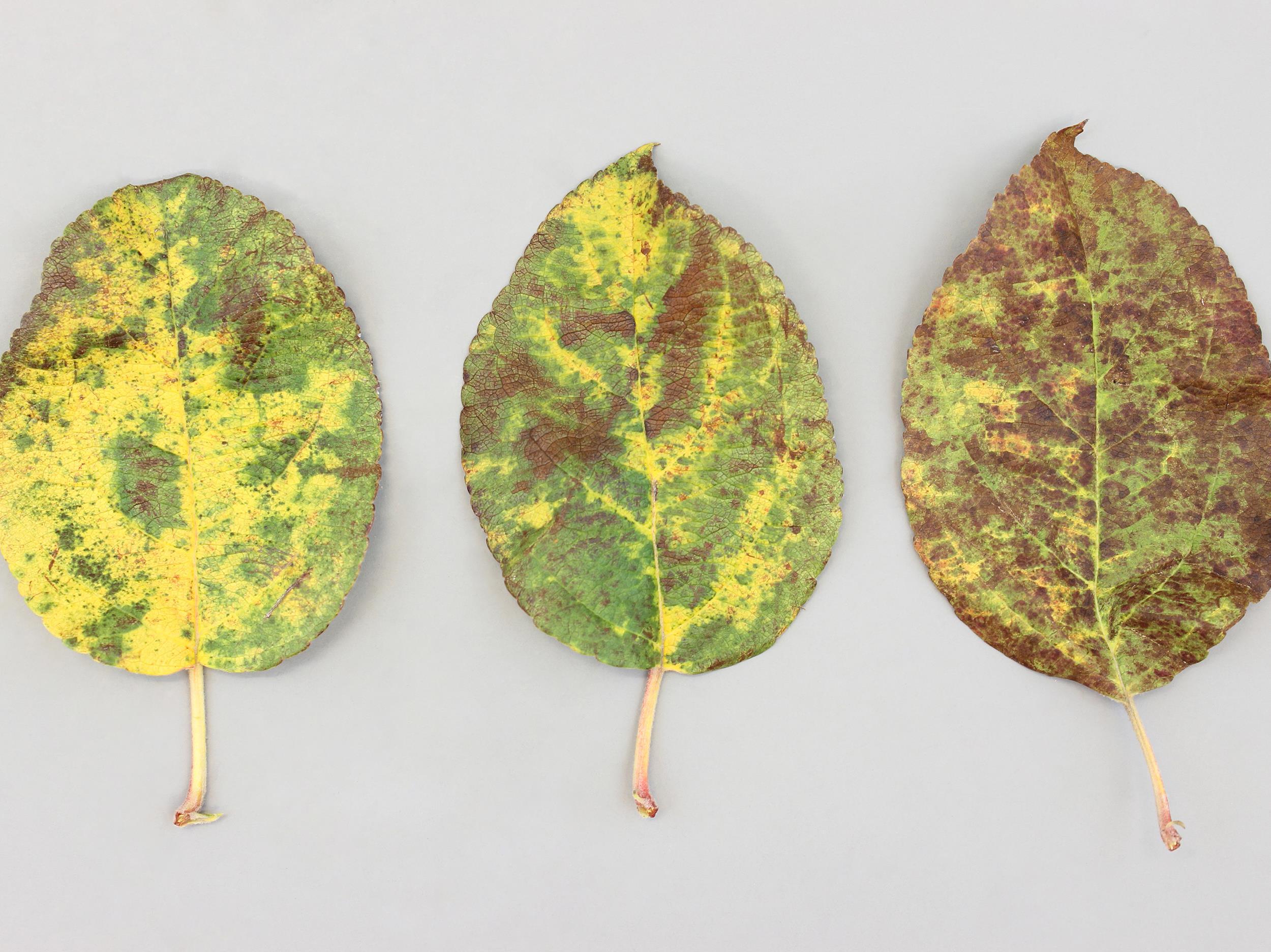 Légende: Jaunissement et brunissement sur feuilles de pommier