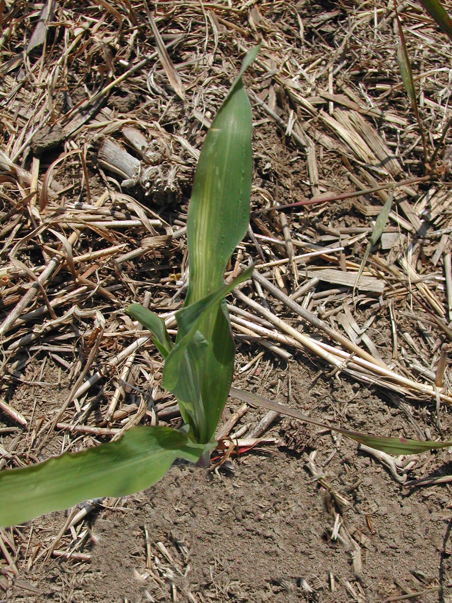 Description: Sur les feuilles basales d’un plant de maïs grain et fourrager d’une production biologique, présence d’un jaunissement à blanchiment du limbe. Les nouvelles feuilles sont déformées mais encore vertes. Ces symptômes sont apparus à la suite d’une dérive de l’herbicide glyphosate appliqué dans un champ de maïs voisin.