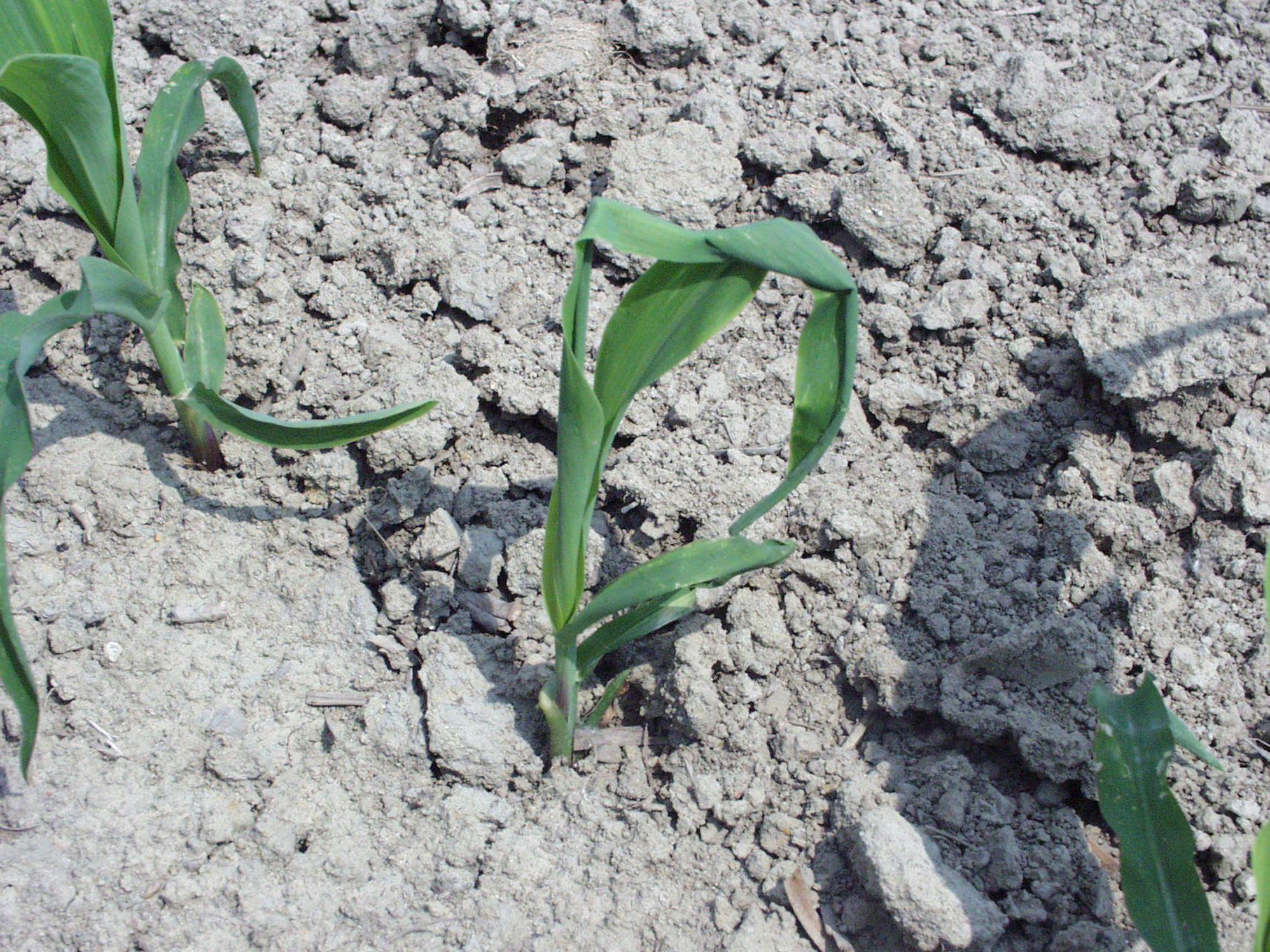 Description: Les feuilles de maïs grains sont gaufrées et parfois enroulées. Le conseiller agricole mentionne que les dommages sont attribuables à une surdose de l’herbicide FRONTIER MAX (diméthénamide-P).