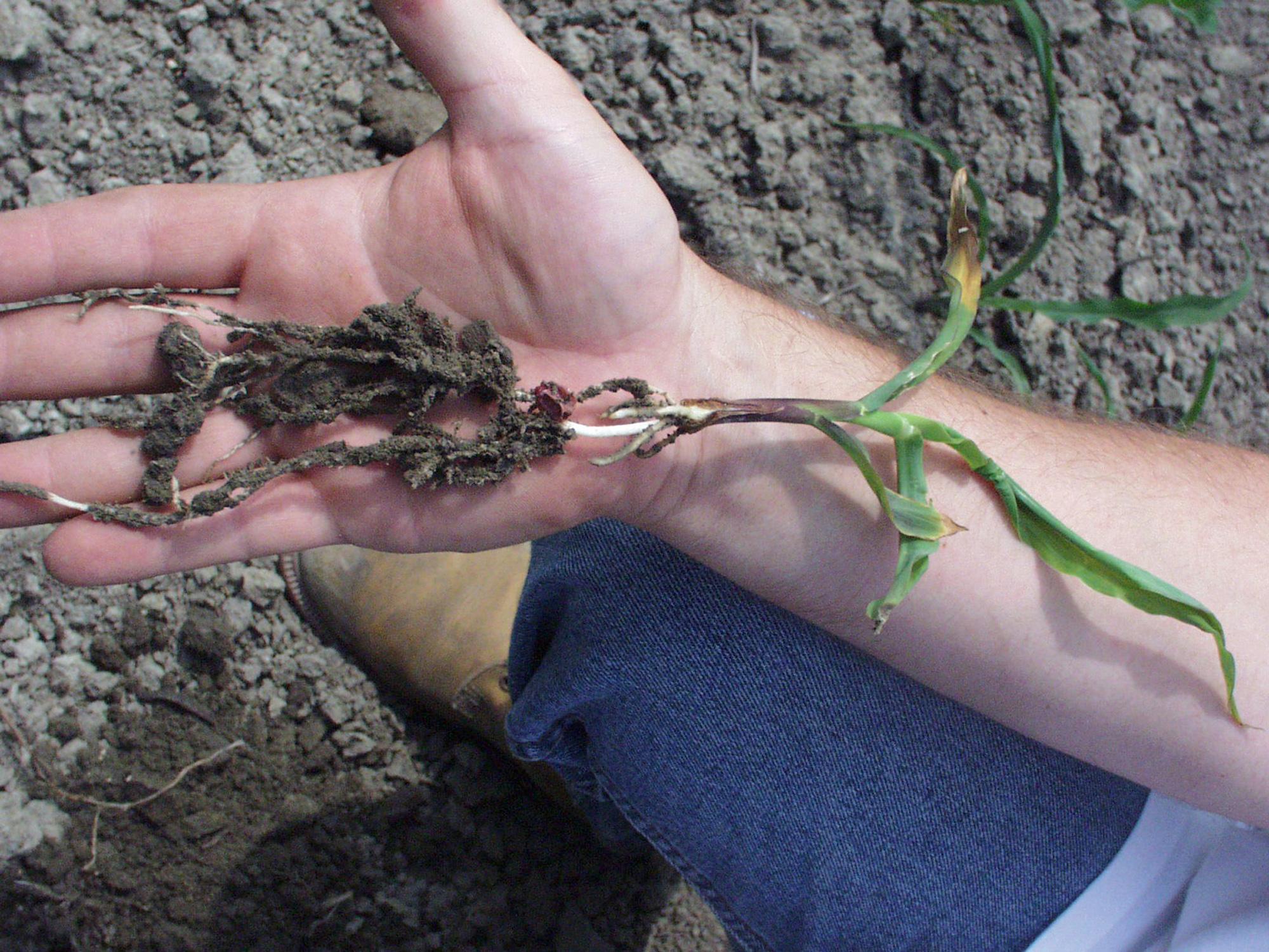 Description: Les feuilles de maïs grain sont déformées et enroulées et la pointe des vieilles feuilles est jaunie et partiellement brûlée. Le conseiller agricole mentionne que les dommages sont attribuables à une surdose de l’herbicide FRONTIER MAX (diméthénamide-P).