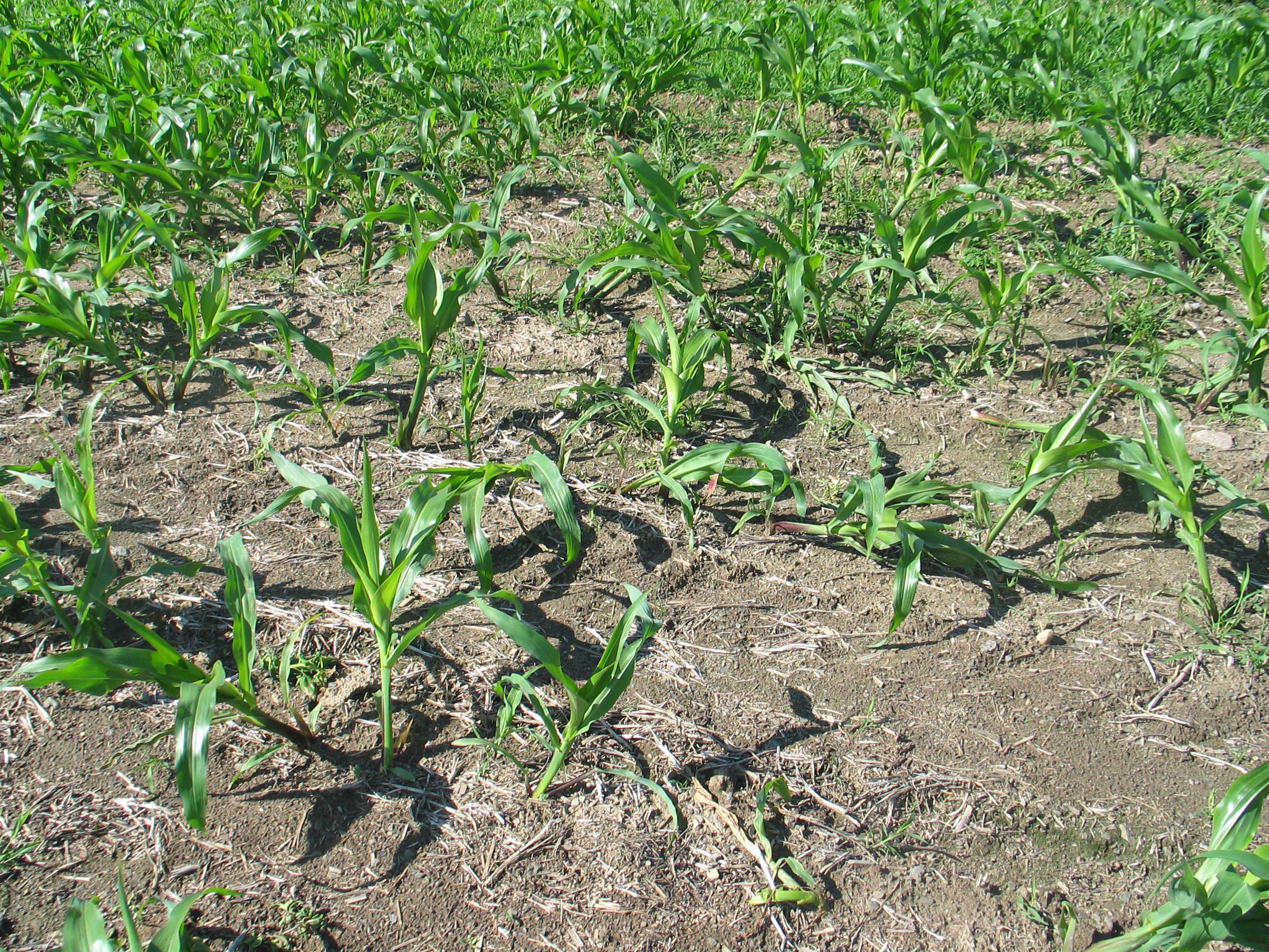 Description: Le collet du plant de maïs grain et fourrager est déformé et n’assure plus son rôle de support, ce qui provoque le flétrissement et la cassure de la partie aérienne des plants. Cette anomalie est attribuable à une application trop tardive et à une dose trop élevée (presque le double de la dose recommandée) de l’herbicide MCPA.