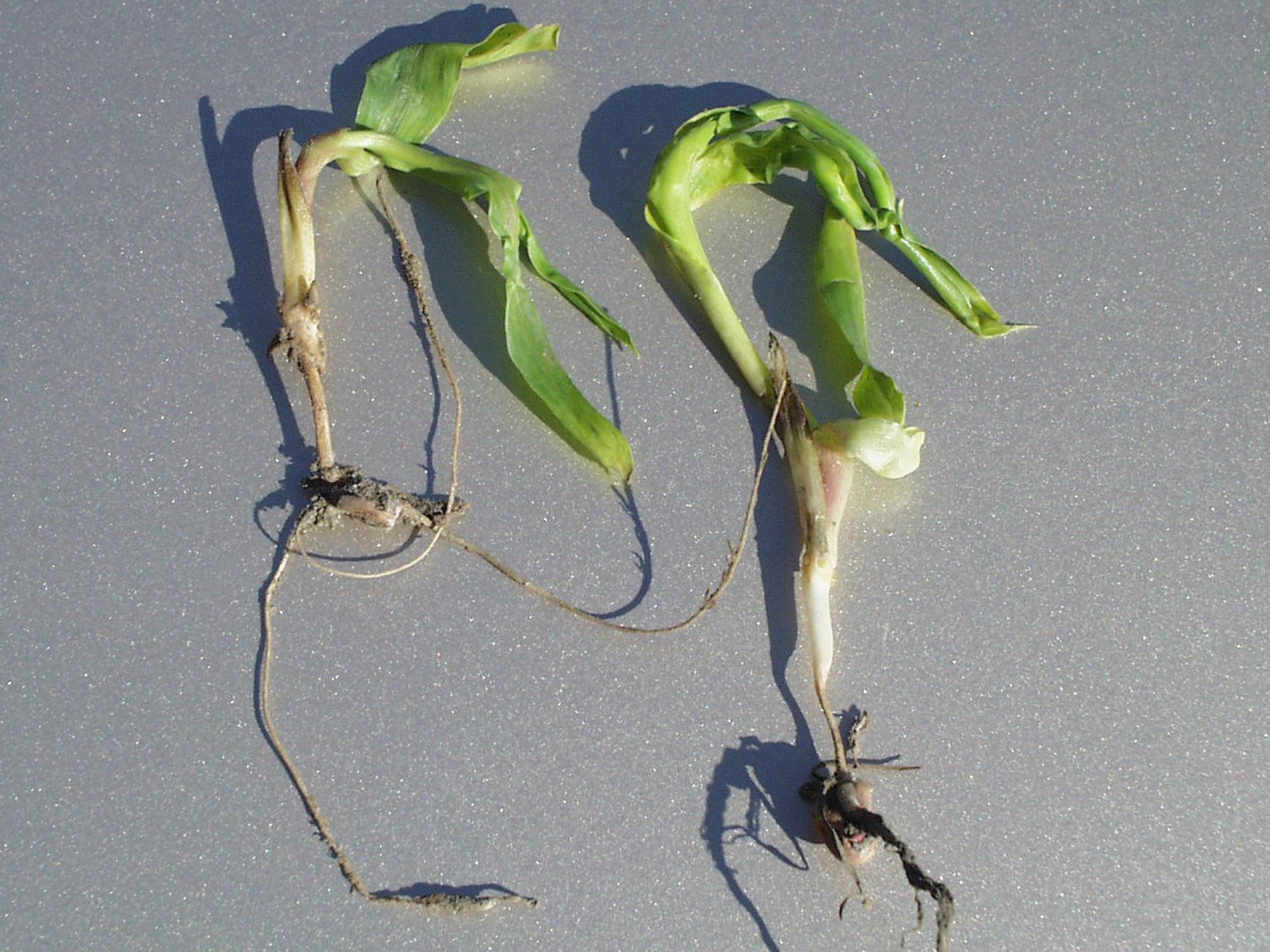 Description: Les plantules de maïs grain et fourrager sont déformées et leur croissance est inhibée. Les feuilles sont enroulées sur elles-mêmes et le système racinaire est peu développé et parfois pourri (peu visible sur cette photo). Le semis trop superficiel a exposé les semences à l’herbicide dicamba.