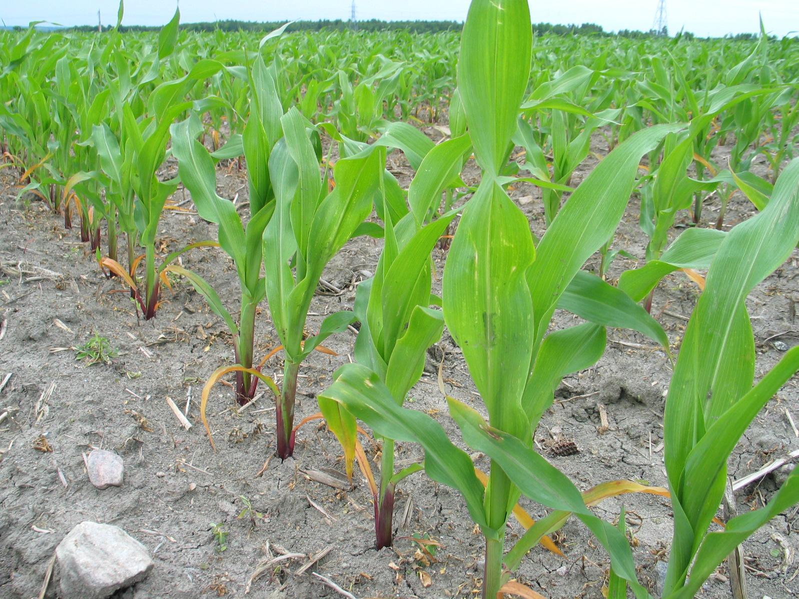 Description: Sur des plants de maïs grain et fourrager, les feuilles basales sont jaunes à orange. Cette anomalie de coloration est attribuable au rimsulfuron (ELIM EP), contenu dans le BATTALIONmd. Ce produit est un mélange de trois herbicides (ELIM EP, BANVEL II et DUAL II MAGNUM). Tous les plants de maïs ont présenté le même symptôme à la suite d’une application foliaire de cet herbicide de contact.