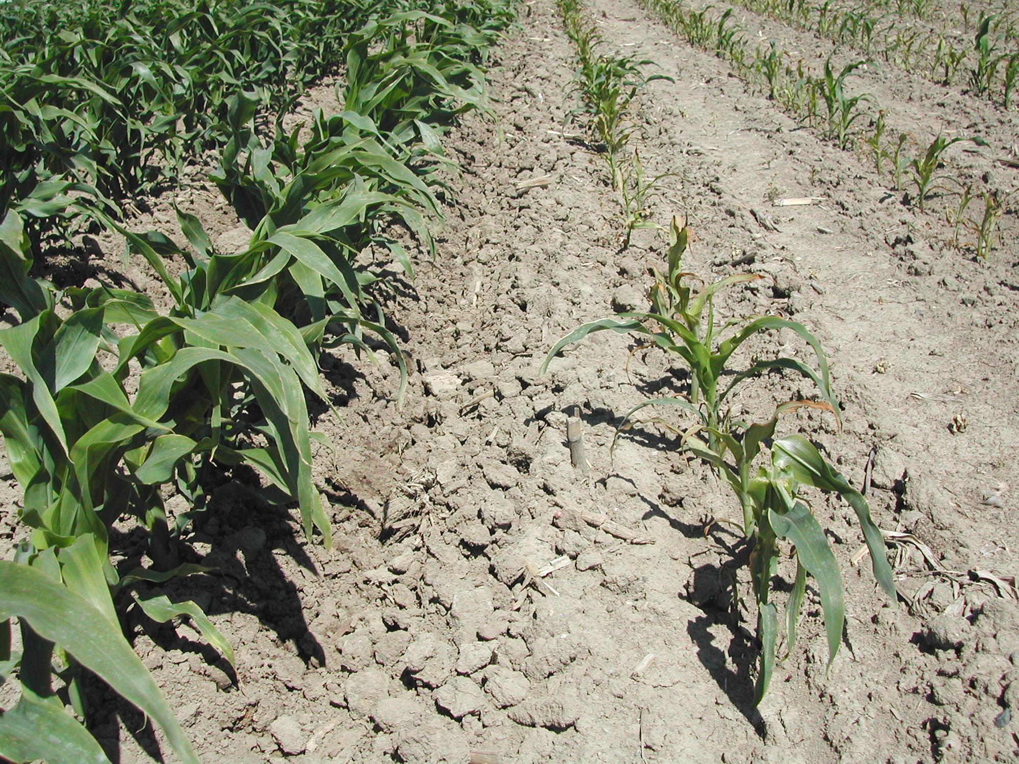 Légende: Plants de maïs grain et fourrager jaunis et faiblement développés