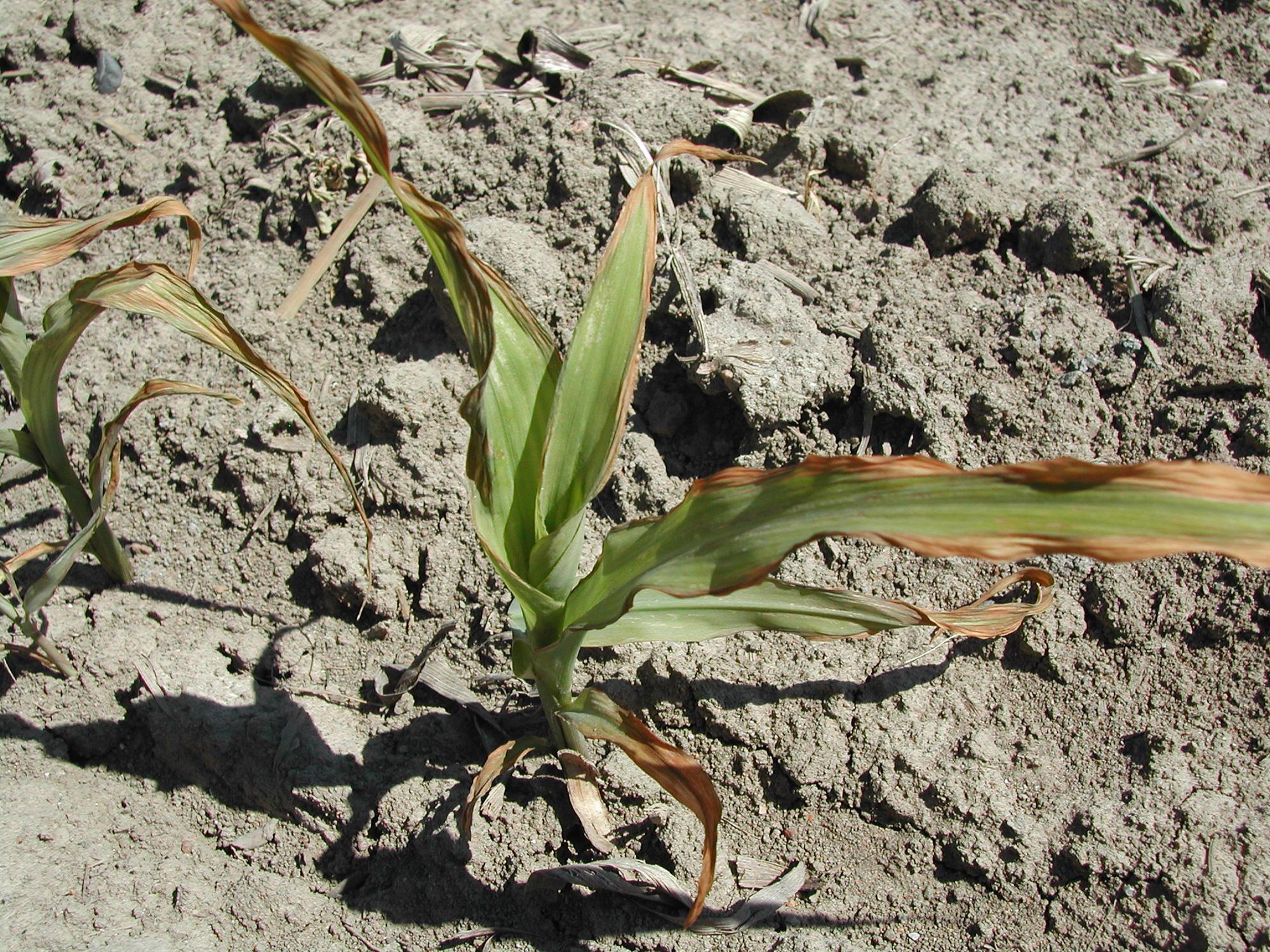 Légende: Plants de maïs grain et fourrager brûlés à l'apex et à la marge des feuilles