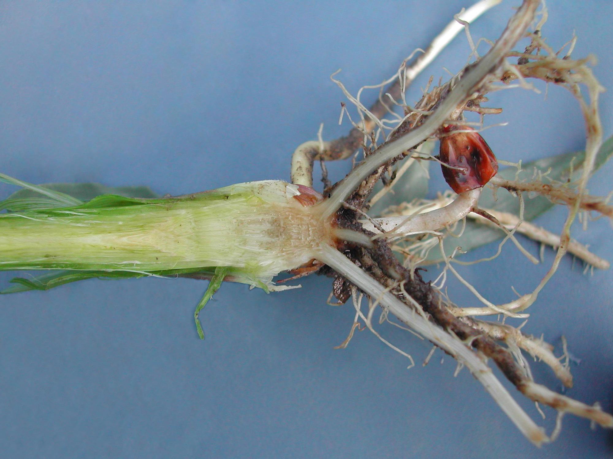 Légende: Faible développement du système racinaire et pourriture au collet d'un plant de maïs grain et fourrager
