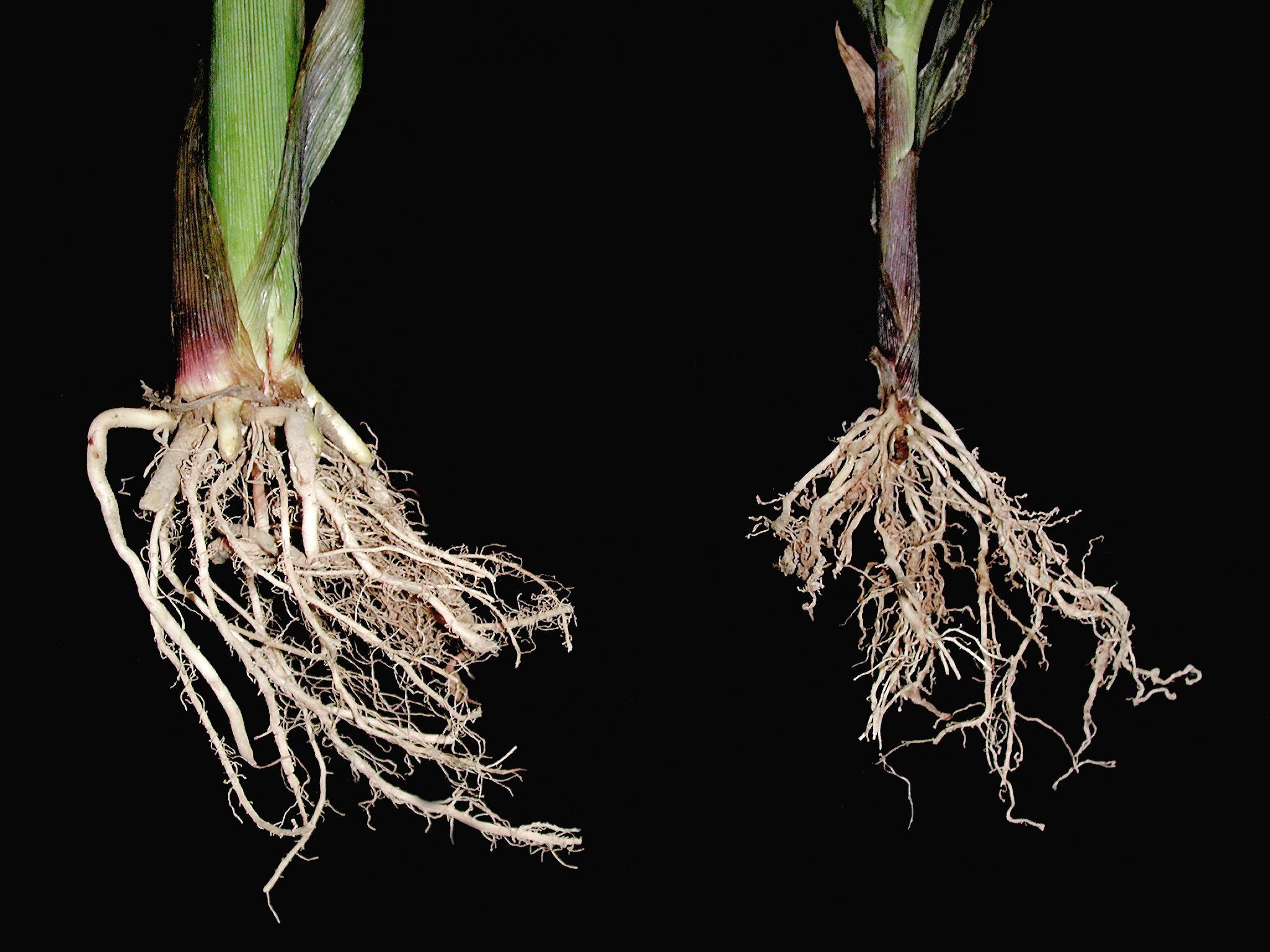 Légende: Comparaison entre un système racinaire de maïs grain et fourrager sain et affecté