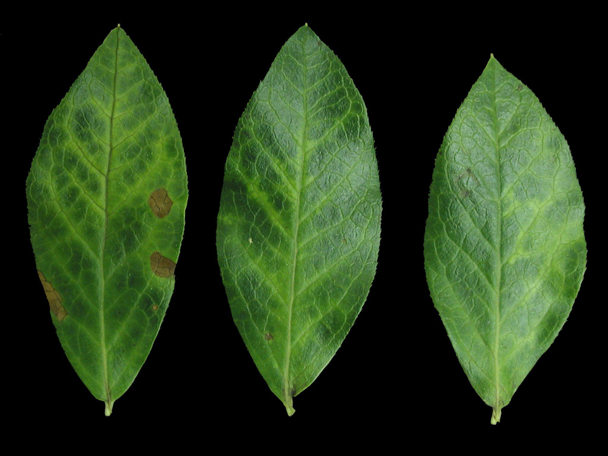 Description: Le premier symptôme observé sur les feuilles de bleuet en corymbe est un jaunissement des nervures, suivi d’un brunissement et d’une brûlure comme celles observées sur la feuille de gauche. Ces symptômes sont causés par une phytotoxicité à l'herbicide terbacil (Sinbar) et affectent principalement les vieilles feuilles.