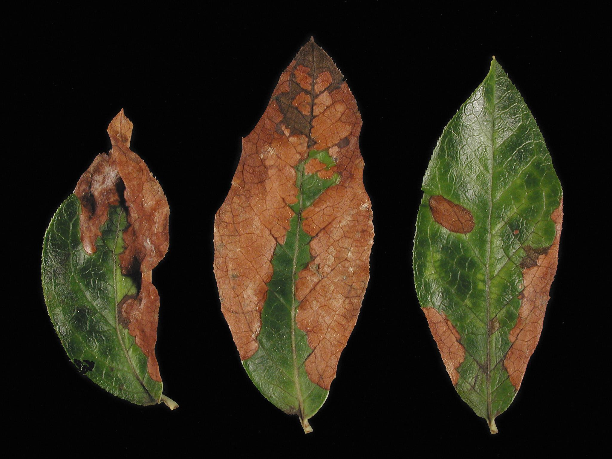 Description: Le premier symptôme observé sur les feuilles de bleuet en corymbe est un jaunissement des nervures, suivi d’un brunissement et de brûlures comme celles observées sur ces feuilles. Ces symptômes sont causés par une phytotoxicité à l'herbicide terbacil (Sinbar) et affectent principalement les vieilles feuilles.