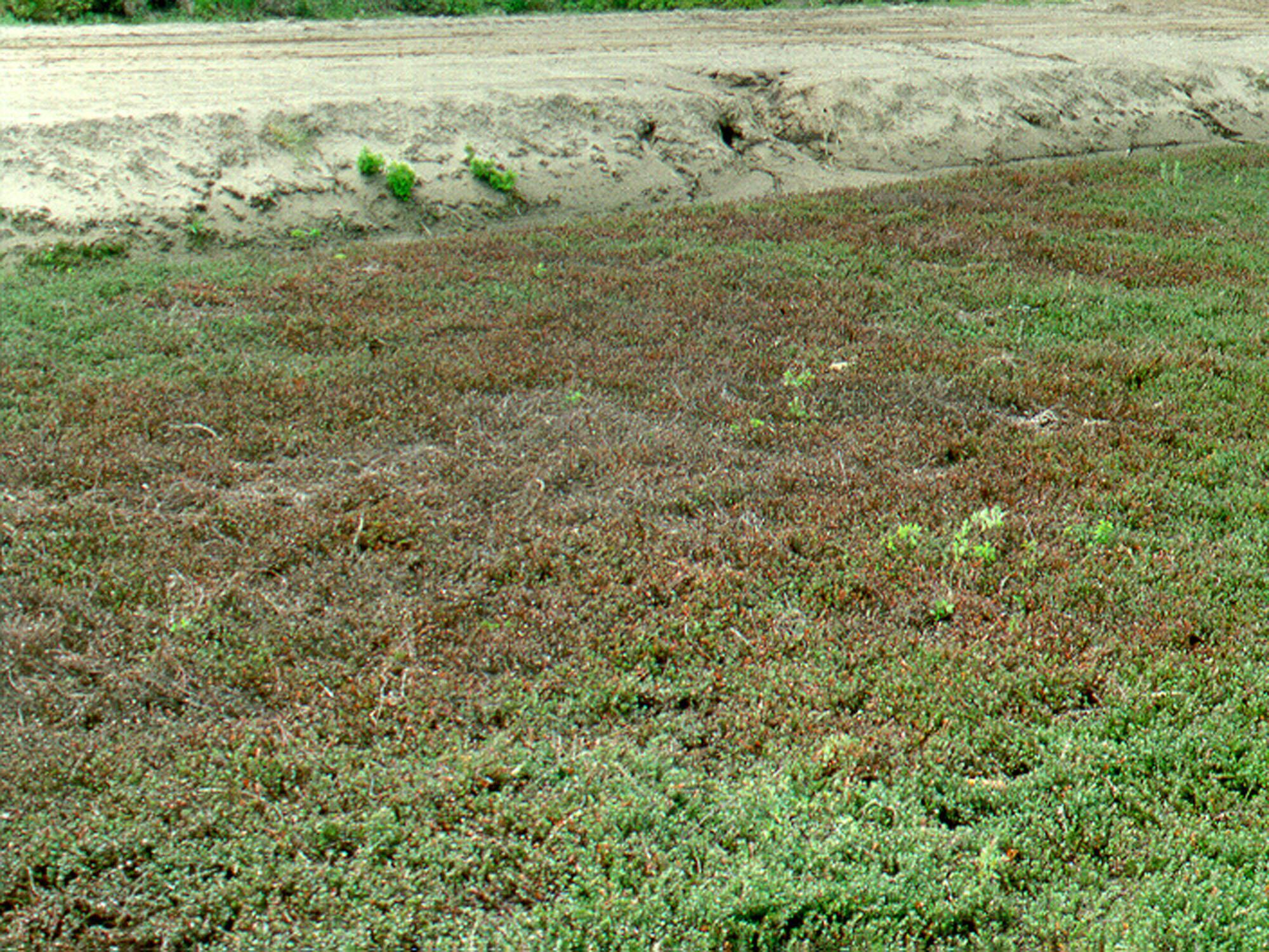Description: Le feuillage des plants de canneberge est devenu rouge à brun à la suite d’une application printanière de l’herbicide dichlobénil (Casoron). C’est probablement le recoupement des zones traitées, à l’extrémité du champ, qui est à l’origine de ce symptôme.