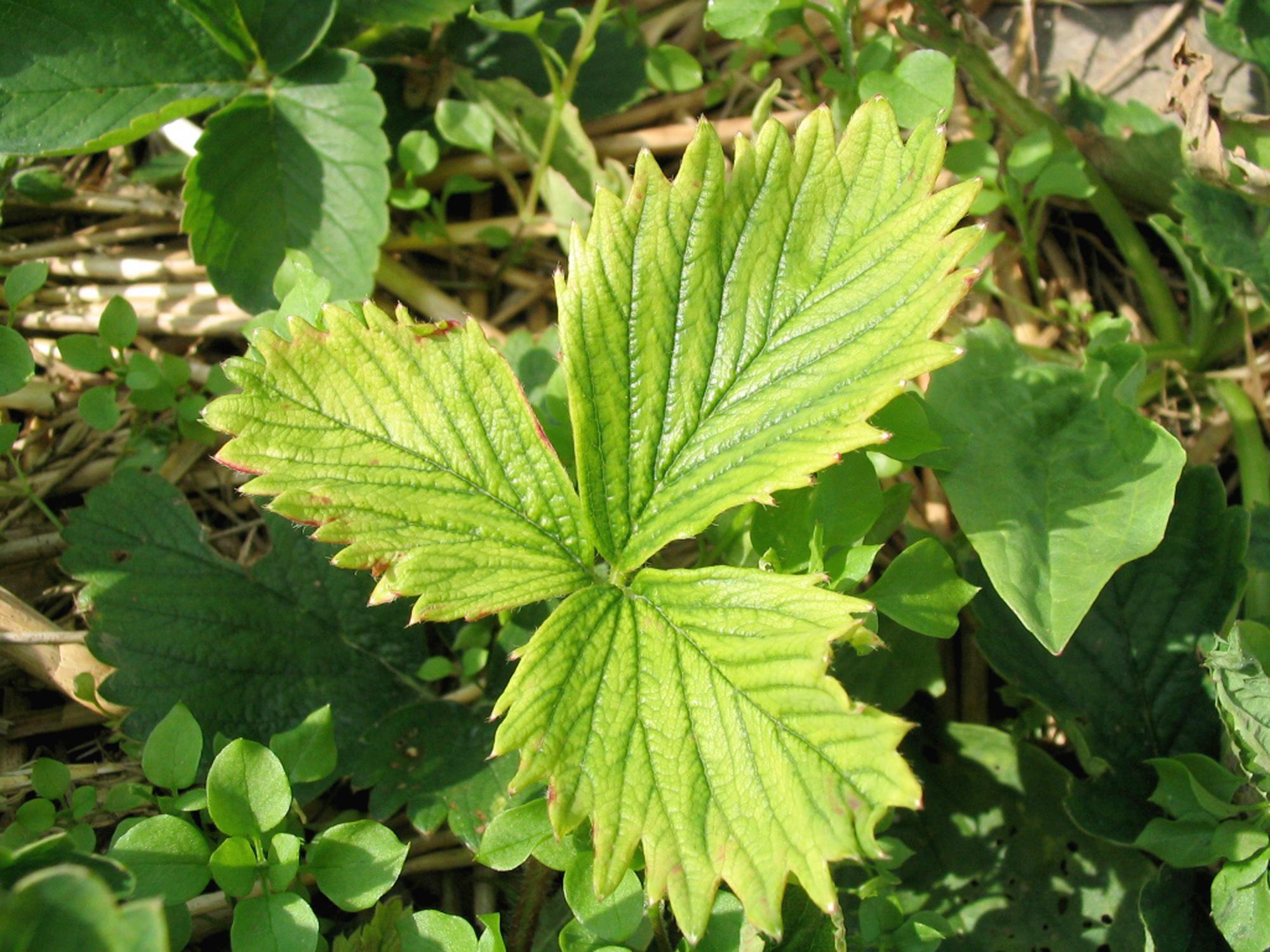 Description: Les jeunes feuilles de fraisier présentent un jaunissement entre les nervures et une discrète coloration rose à la marge de certaines folioles. Ces symptômes sont causés par une phytotoxicité au glyphosate à la suite d’une dérive provenant d’un traitement effectué en bordure du champ.