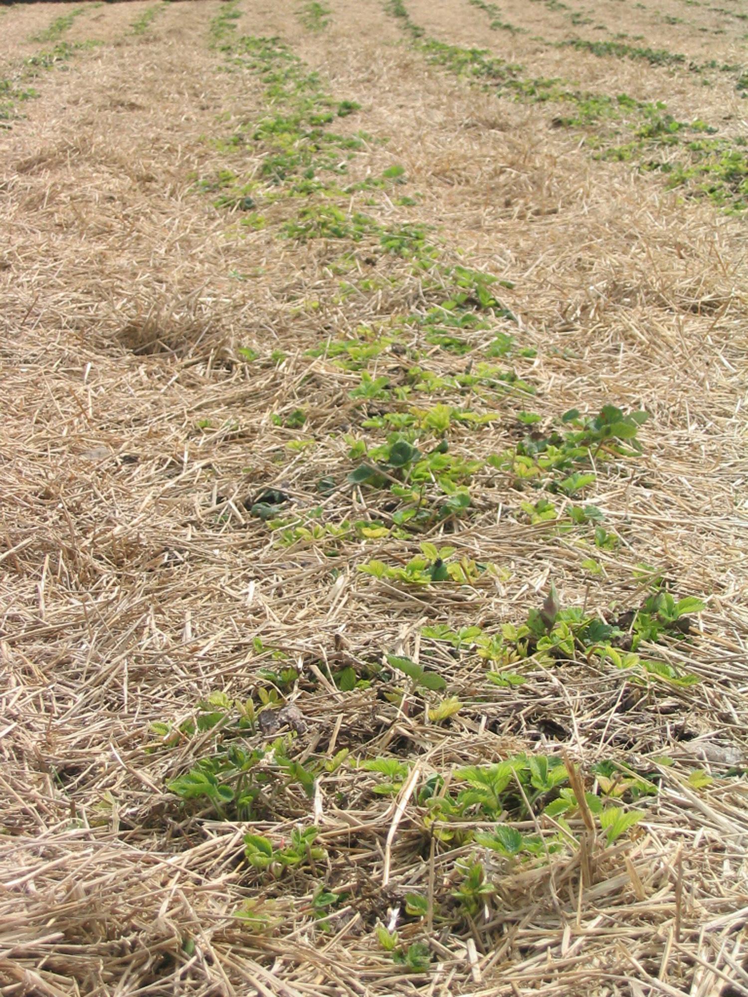Description: Au champ, les plants sont faiblement développés. Les jeunes feuilles de fraisier ont une coloration jaune à vert pâle et sont en forme de cuillère. Ces symptômes sont causés par une phytotoxicité occasionnée par l'utilisation de paille de céréales traitée au glyphosate en prérécolte.