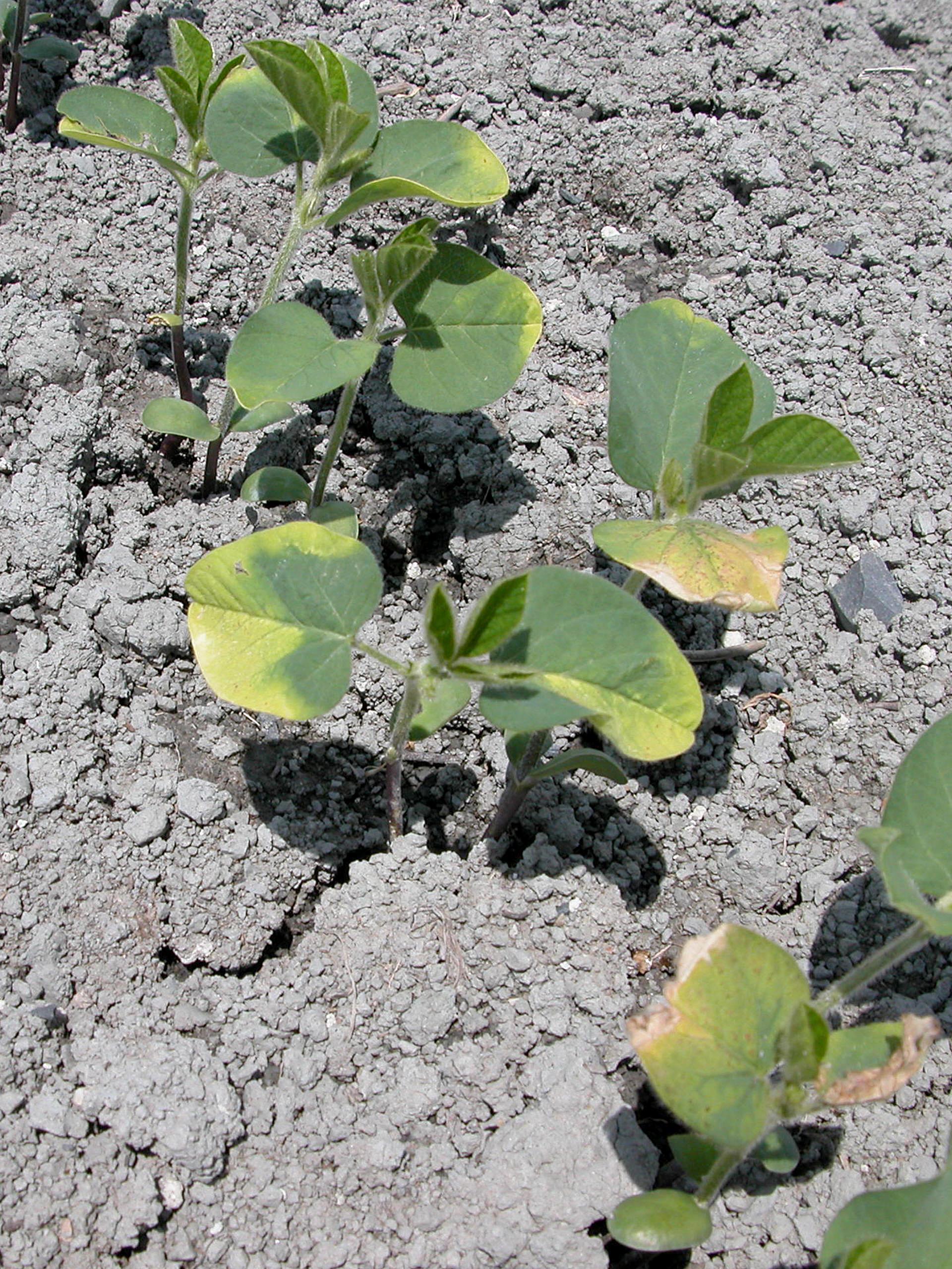 Description: Des plants de soya montrent un jaunissement des feuilles basales débutant à l’apex et progressant vers le limbe. Le symptôme est attribuable à l’application de métribuzine, réalisée huit jours auparavant. La dose appliquée est inconnue.